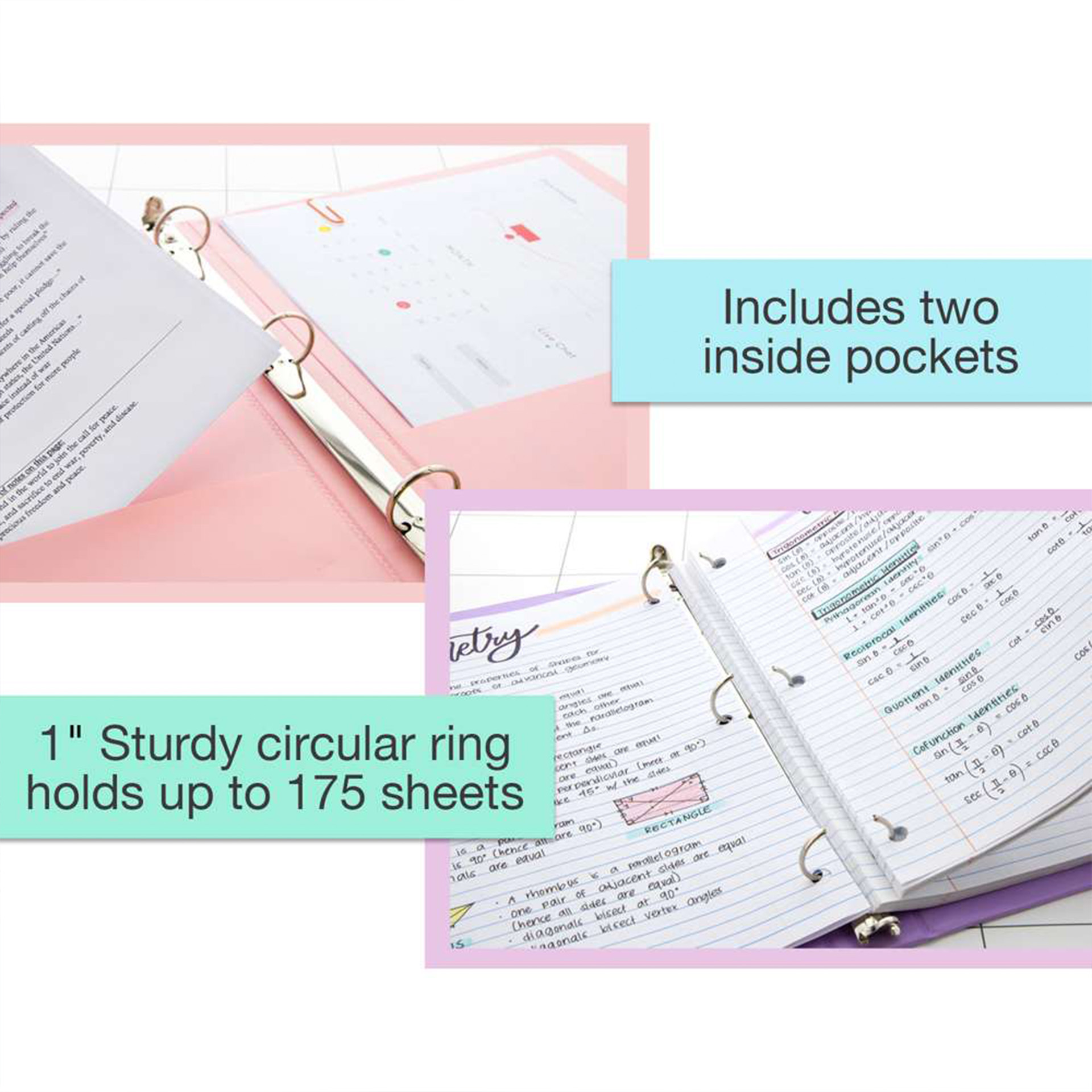 Keep your documents organized, protected, and easy to access with this 1-inch archival-safe binder. Designed to hold up to 175 sheets, the binder features durable rings that open and close smoothly for quick page additions or removals. Ideal for students, teachers, and professionals, it’s perfect for storing reports, presentations, assignments, and other important papers. The tear-resistant cover includes clear view sleeves on the front, back, and spine, so you can personalize or label your binder with ease. Two interior pockets offer extra storage for loose pages or notes. With a smooth, high-quality finish in vibrant, fun colors and a board made from 100% recycled materials, this binder combines style, practicality, and eco-consciousness for everyday use. Sold individually in Pink, Blue, Teal, or Lavender (no color choice).