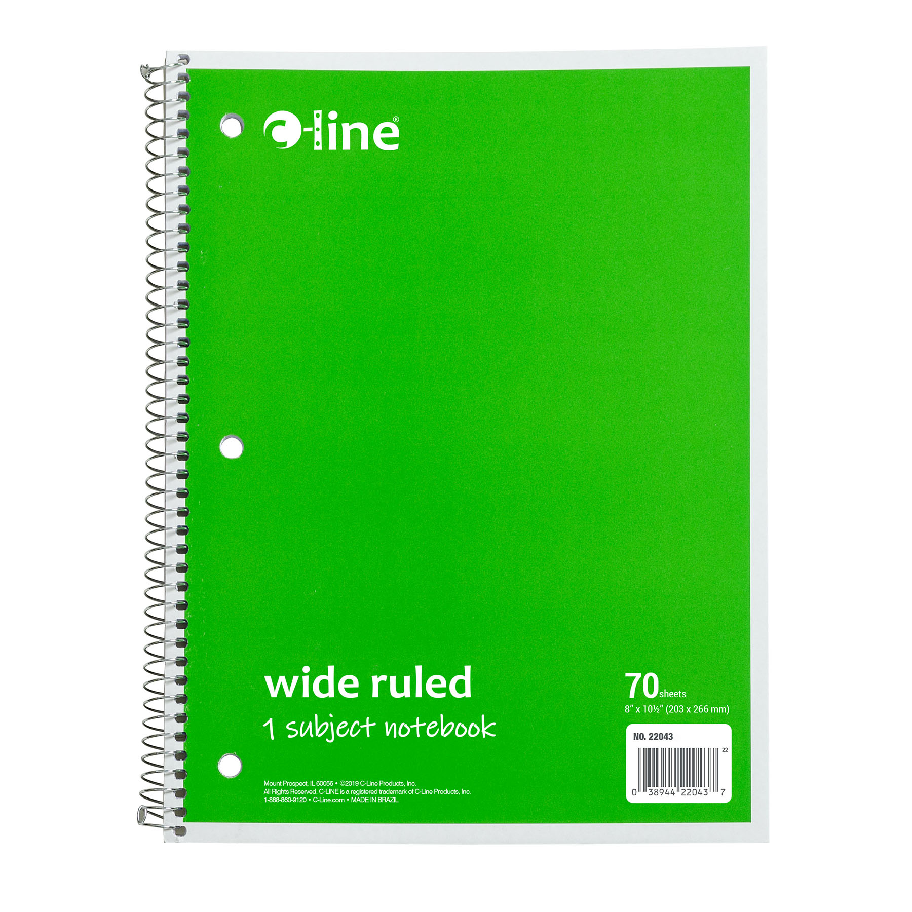 Instantly create writing space in binders and folders, by inserting the Spiral-Bound 1-Subject Notebook. Perfect for students and professionals, these notebooks feature a durable cover that helps protect the content written on the pages inside. Wide ruled format: the bright white paper has blue handwriting lines with a red margin divider to allow for neat writing. Solid colored front cover adds style to notebooks, while also making it easy to organize projects or classes by color. Attach this 3-hole punched spiral notebook into a standard 3-ring binder to create the ultimate organizational tool that keeps all your notes and hand-outs in one place. Perforated edges reduce paper waste by allowing pages to tear out neatly. 70-page spiral bound notebook. Colored front cover, gray board back cover. Green. Sold individually.