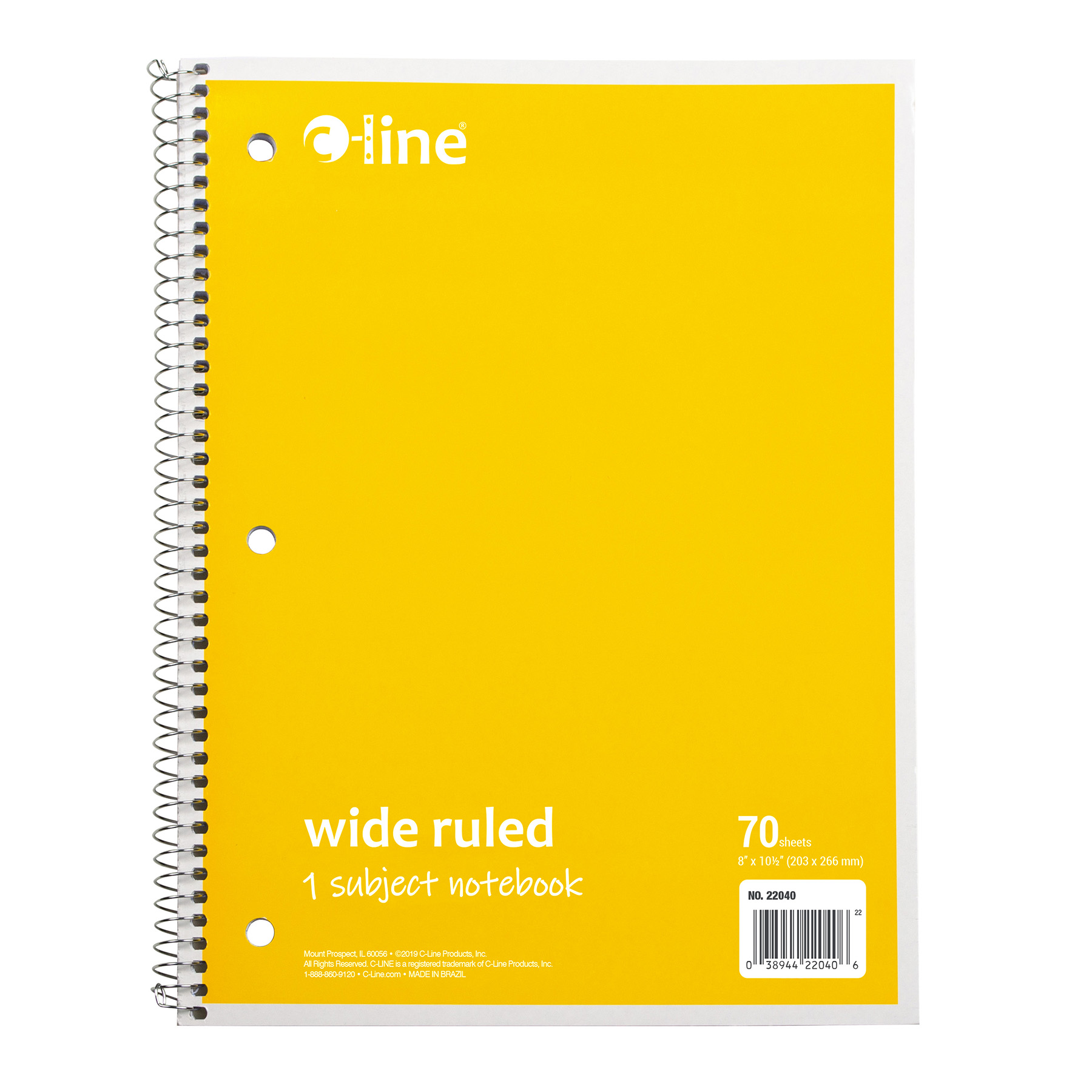 Instantly create writing space in binders and folders, by inserting the Spiral-Bound 1-Subject Notebook. Perfect for students and professionals, these notebooks feature a durable cover that helps protect the content written on the pages inside. Wide ruled format: the bright white paper has blue handwriting lines with a red margin divider to allow for neat writing. Solid colored front cover adds style to notebooks, while also making it easy to organize projects or classes by color. Attach this 3-hole punched spiral notebook into a standard 3-ring binder to create the ultimate organizational tool that keeps all your notes and hand-outs in one place. Perforated edges reduce paper waste by allowing pages to tear out neatly. 70-page spiral bound notebook. Colored front cover, gray board back cover. Yellow. Sold individually.