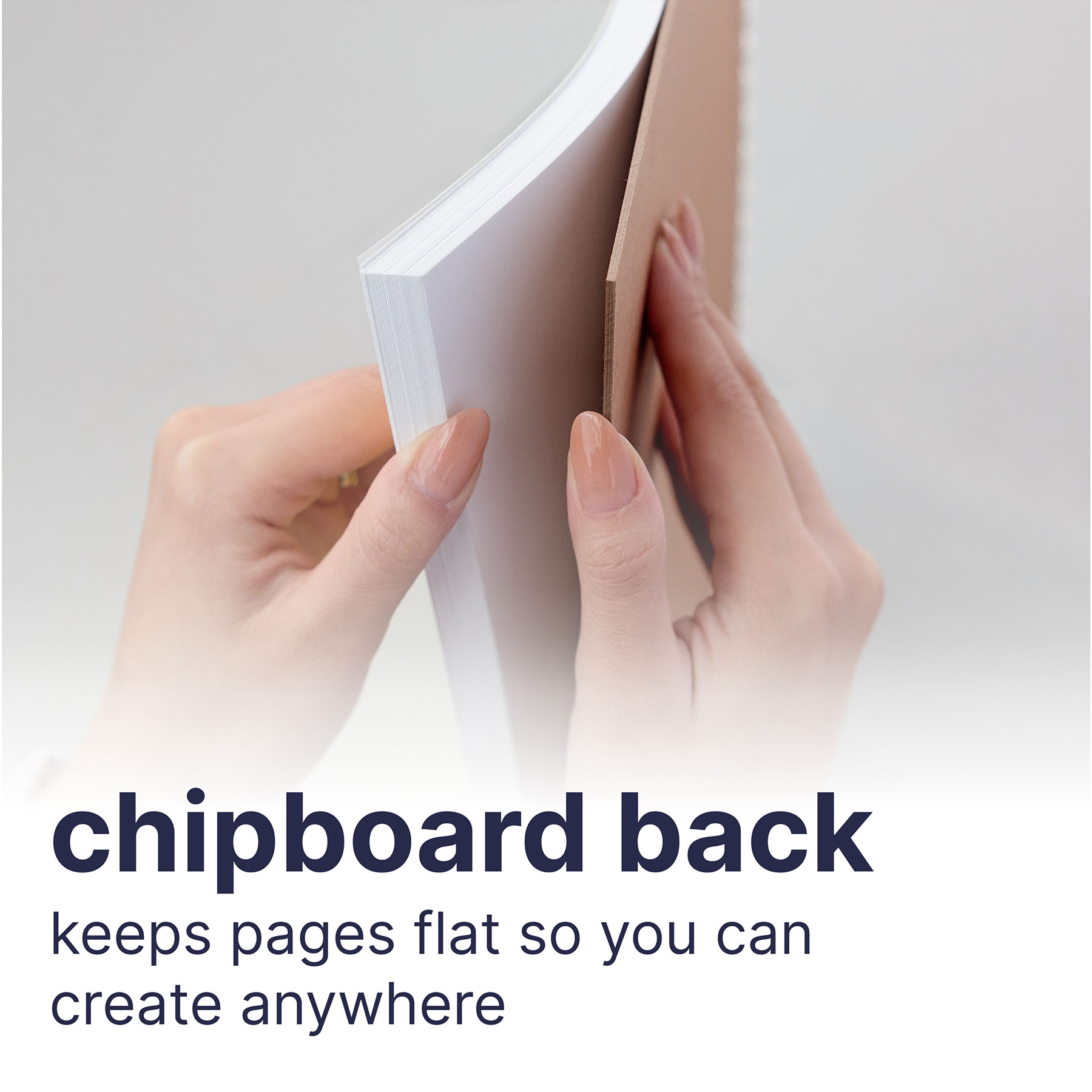 v : LAY FLAT, DURABLE & PORTABLE—Constructed with a durable cover & chipboard backing; take your sketchbook wherever inspiration strikes & never miss a creative moment