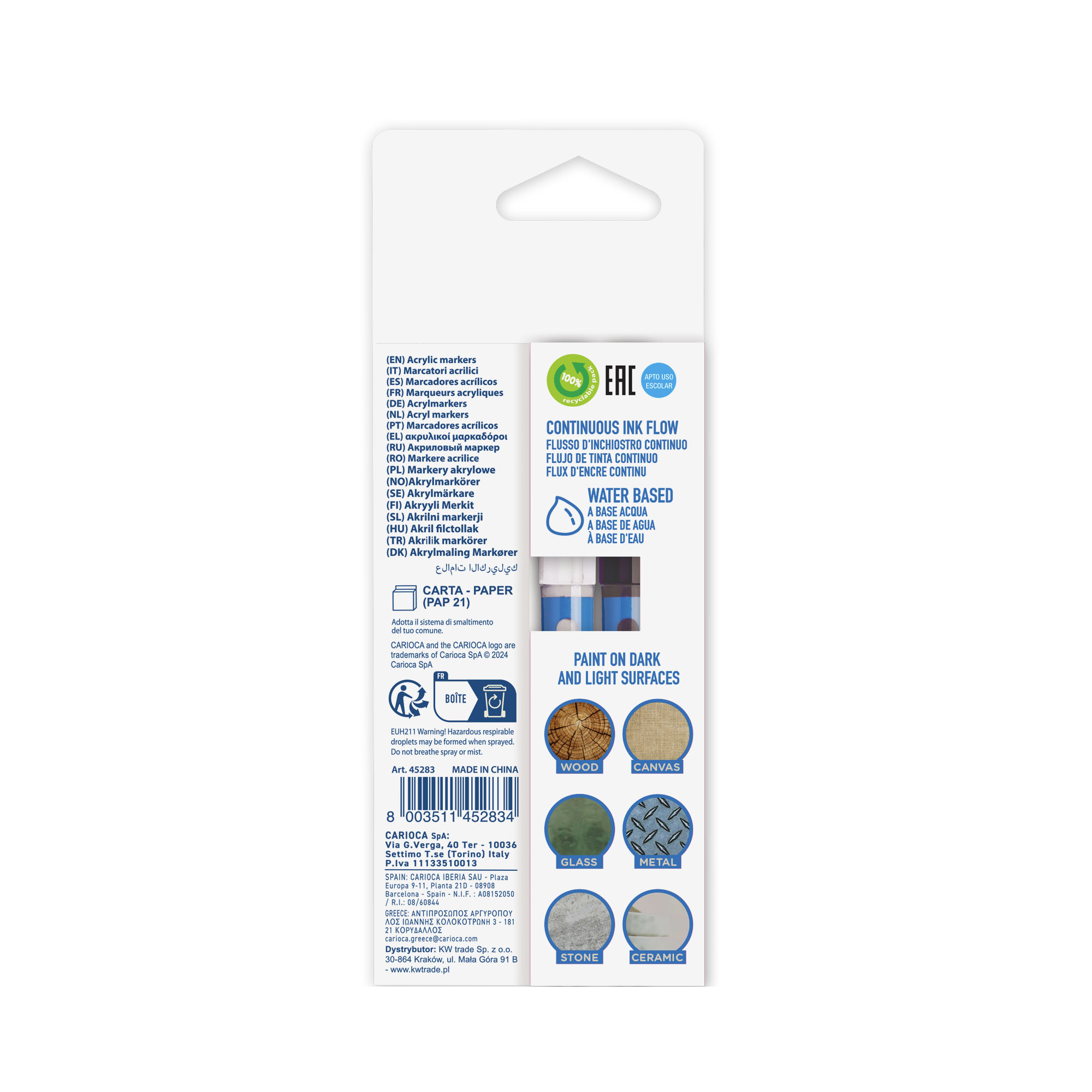The Carioca Acrylic Paint Markers – 2 Pieces are perfect for artists and crafters looking for versatility and ease of use. Each marker features an artistic brush tip that stays moist and ready to use without any activation, allowing for smooth, expressive strokes. The high-opacity, water-based ink works beautifully on a wide variety of surfaces including wood, glass, metal, stone, ceramics, and cardboard. These markers are ideal for creating vibrant, long-lasting designs with precision and control, whether for home projects, school crafts, or professional artwork. The set comes in a convenient box of five, providing a selection of colors to bring any creative idea to life.