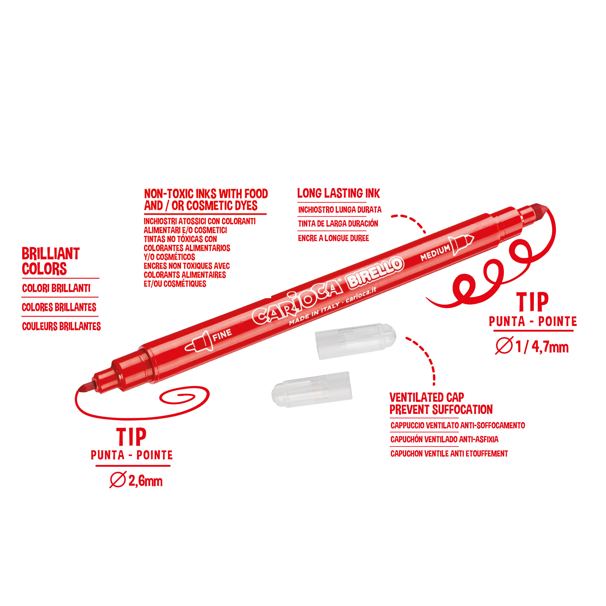 The Carioca Birello Double Tip Felt Tip Pens – 12 Pieces offer twice the creative possibilities with a fine tip on one end and a medium tip on the other. Perfect for both detailed work and bold coloring, these versatile markers are filled with nontoxic, super washable ink that can be easily cleaned from skin and most fabrics using just water. Designed for safe and enjoyable use, they are ideal for school projects, art activities, and everyday creativity. Proudly Made in Italy, this set combines quality craftsmanship with vibrant, long-lasting colors in a compact, practical box.