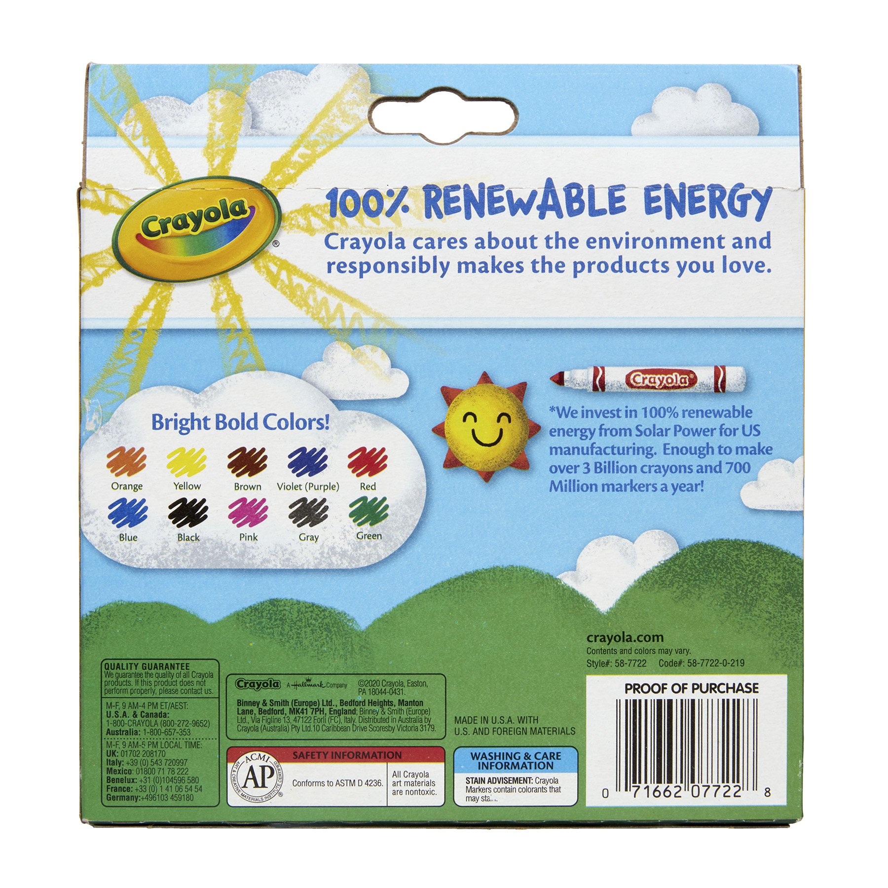 This assortment of markers features 10 classic Crayola colors with high-quality, true-to-color ink. Add bold, vibrant color to artwork, school assignments, and other creative projects. The variety of bright, classic colors in this pack invites imaginative expression. Crayola Broad Line Markers have sturdy conical tips that make them ideal for a variety of classroom and group art projects. Great for coloring in large areas, these markers also work well for drawing thin lines or dots. Broad-line markers lay down plenty of color and won’t smudge or bleed through paper. Crayola Markers contain recycled plastic resin, which keeps hundreds of tons of plastic out of landfills every year. Bring beauty and color to your world and help keep plastic out of landfills. Crayola art supplies and activities help children express, create, and connect through colorful play. Each box includes 10 Crayola Broad Line Markers in Classic Colors.