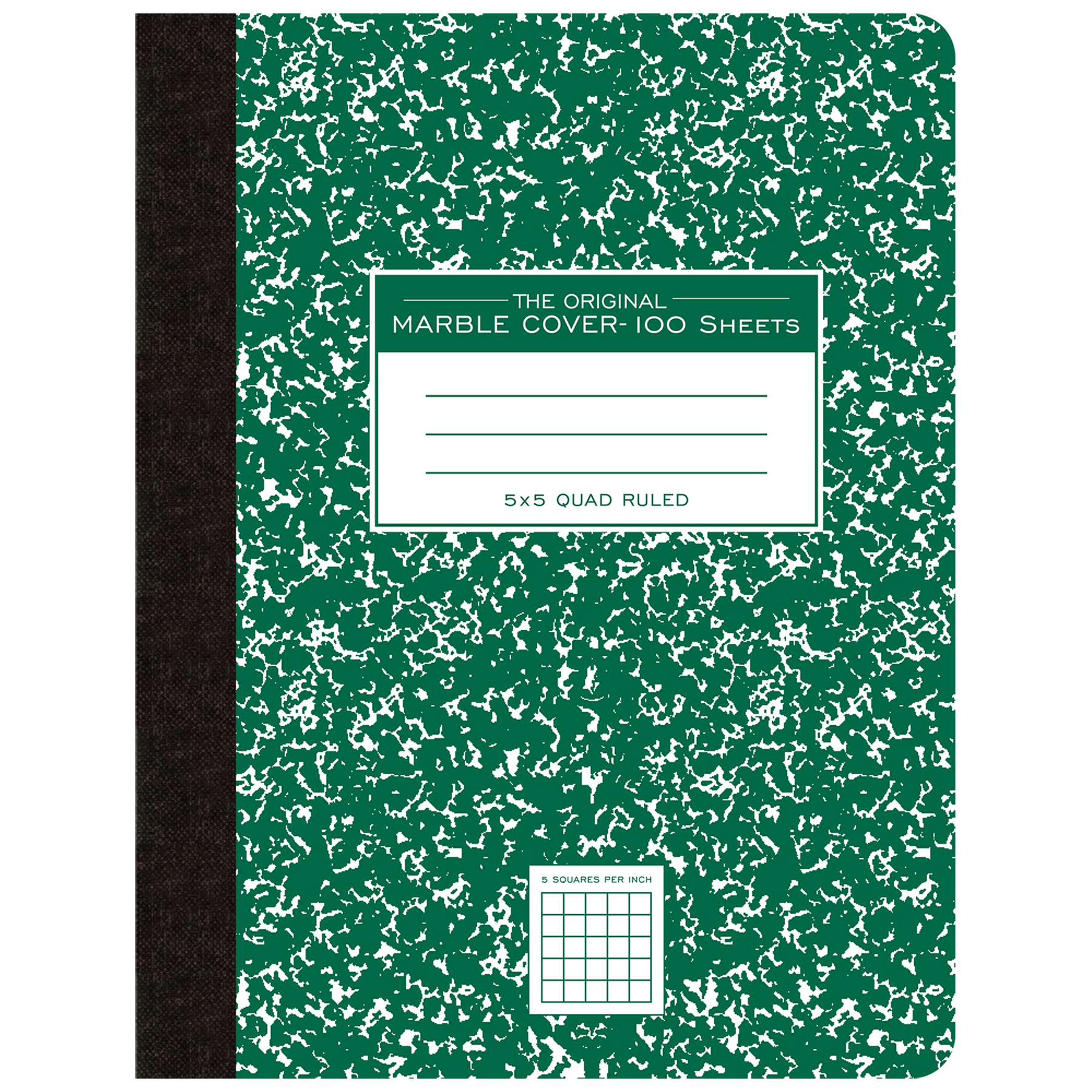 Record your notes in this permanently bound composition book. Paper is smooth 15# writing paper printed with a 5×5 graph grid pattern. Covers are a hard white board that are printed in the traditional green marble pattern. Inside of covers is printed with class schedule and other useful information. Each book is produced with center-sewn and tape bound construction, not designed for sheet tear-out. Sheet size is 9.75″ x 7.5″ and there are 100 sheets per book. Made in Sri Lanka.