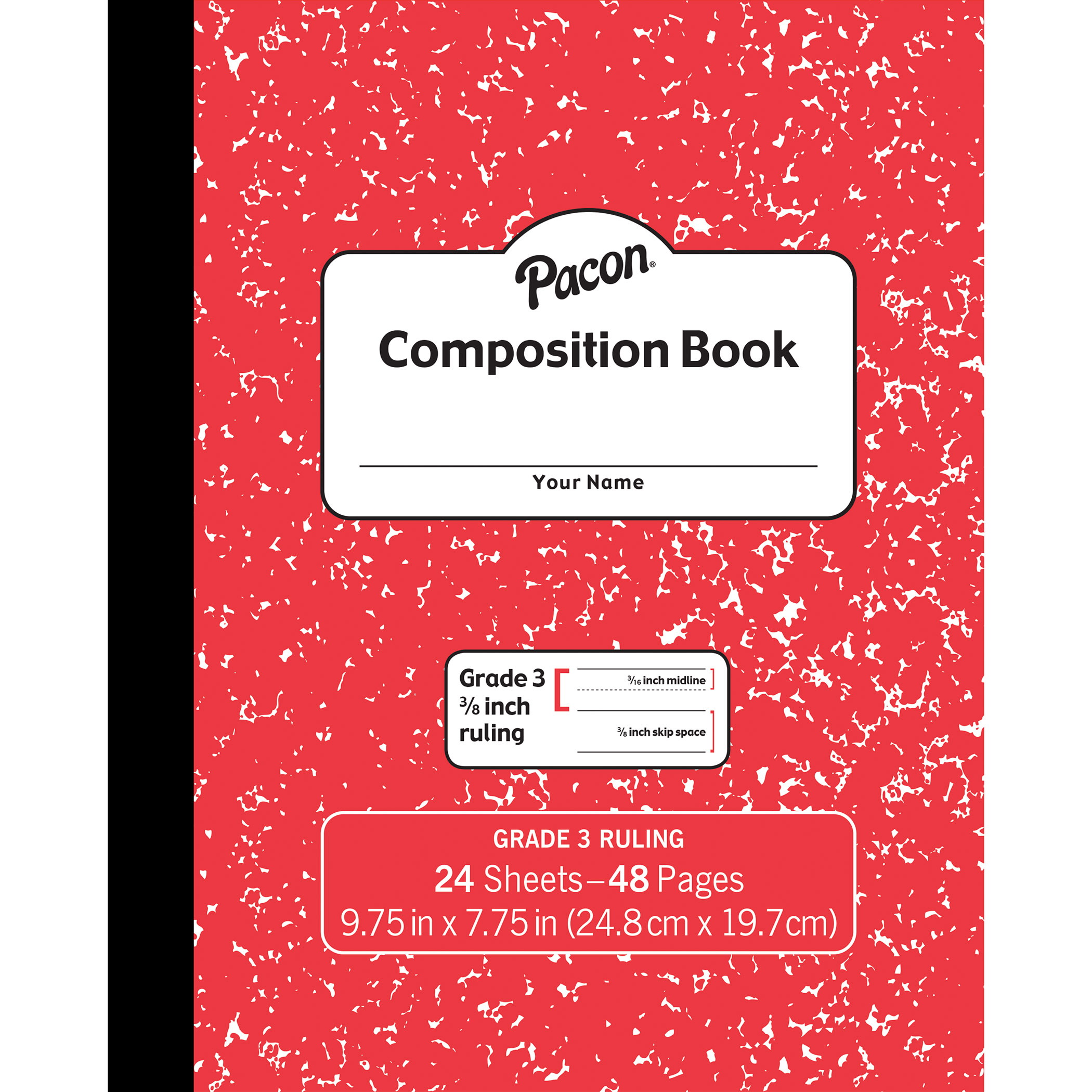 Red marble composition book with a durable soft cover and 24 sheets to meet your needs. Primary grade 3, and ruled 3/8″ x 3/16″ x 3/16″. Great for note taking and journaling. Recyclable. Measures 9.75″ x 7.75″.