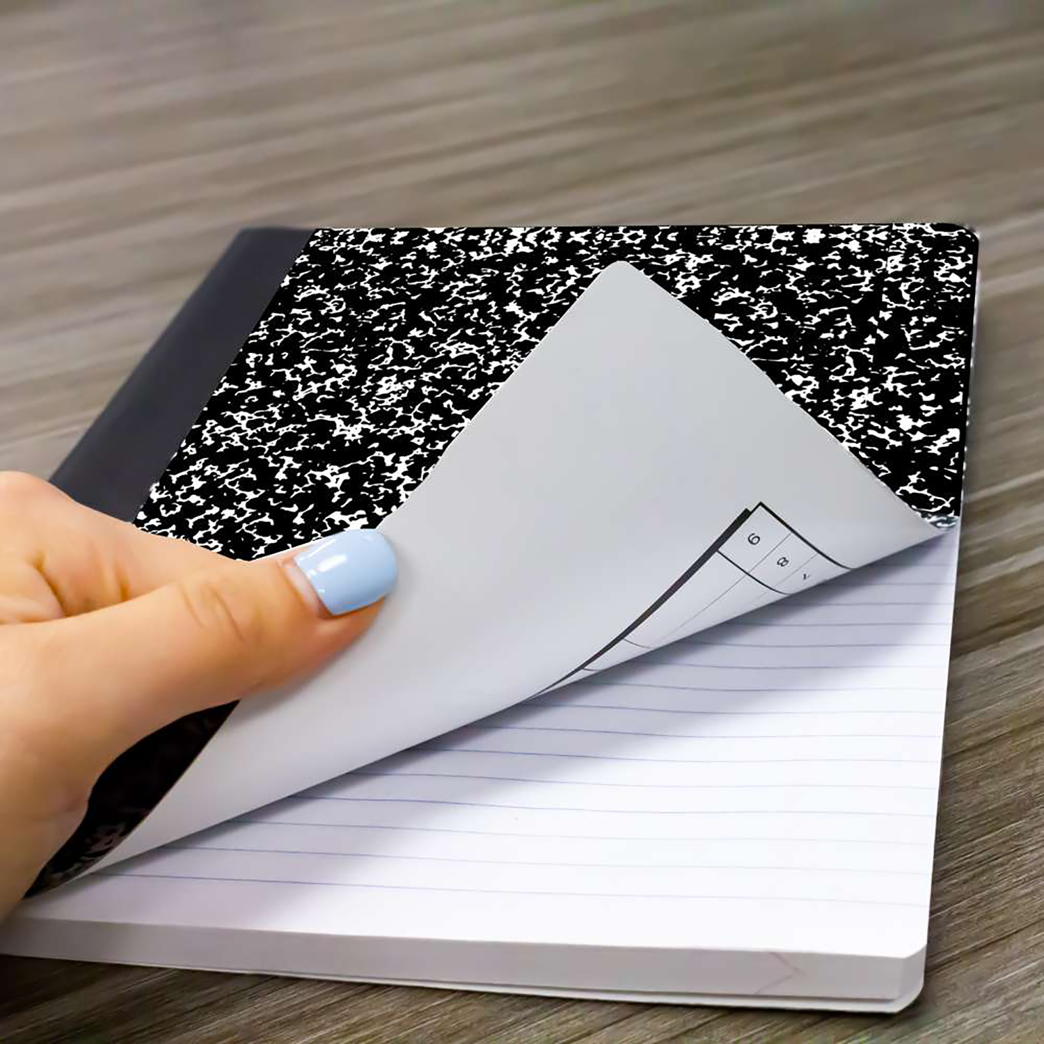 i : SIMPLY NOTETAKING. Black marble composition notebooks come with 100 sheets of wide-ruled paper. Ready for any assignment and take it with you on the go! Overall Size: 9.75″ x 7.5″.