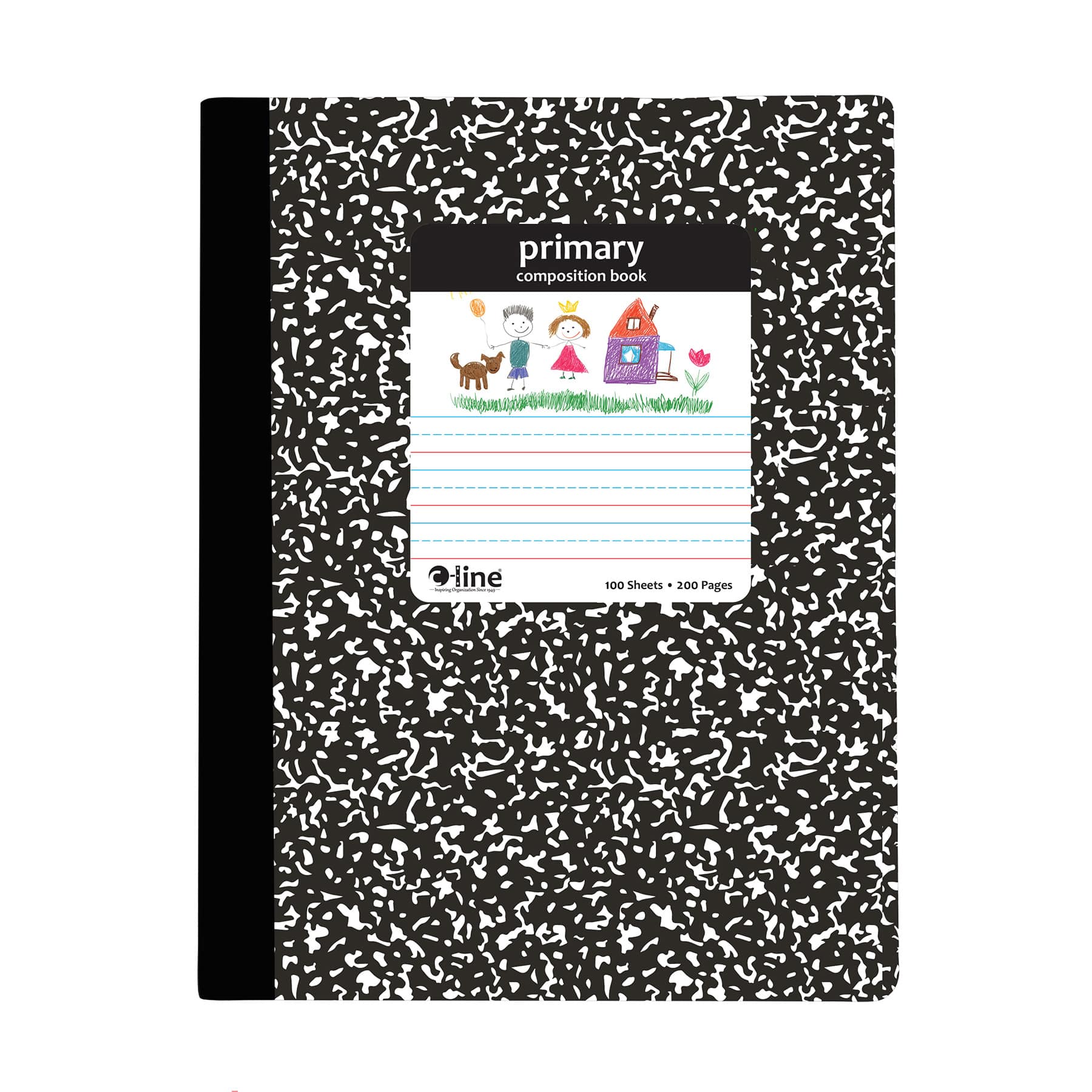 Help students improve writing and drawing skills with C-Line’s Primary Composition Book. Students can draw pictures and create stories using their primary comp book. Pages feature primary ruling for story writing and a blank space for illustrations. The wide-ruled bottom portion of the page contains a red baseline and dotted lines to aid in letter positioning while the top portion of the page is unruled and can be used to draw pictures to bring the story to life! Great for beginner students to reinforce proper handwriting skills. Ideal for note-taking and story development. Bright white paper in wide-ruled format allows space for neat writing. Each notebook has 100 sheets sewn into the heavyweight covers to protect the content inside. Black marble design on the front and back cover. Inside front cover shows alphabet and numbers. Inside back cover illustrates “How To Write A Story”. Good for grades K-2. Size is 7.5″ x 9.75″. Includes 1 composition book.