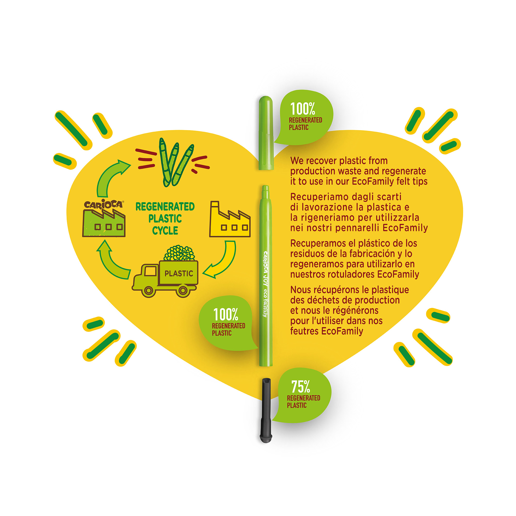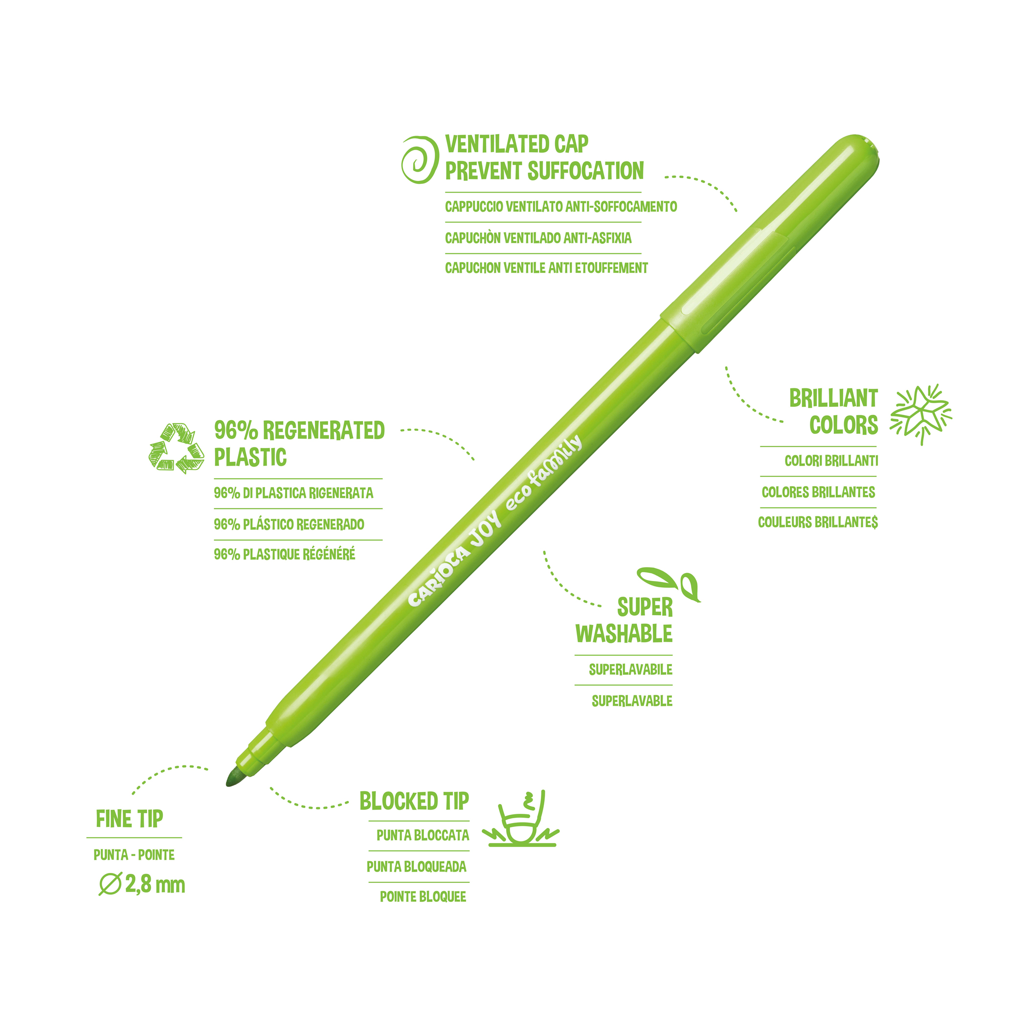 The Carioca Eco Family Joy Fine Tip Felt Tip Pens – 12 Pieces combine eco-conscious design with vibrant, precise coloring. Made from 98% regenerated plastic, these markers are an environmentally friendly choice for artists of all ages. The fine 2.8 mm blocked tip is perfect for detailed work while remaining durable for long-lasting use. With super washable ink, cleanup from skin and most fabrics is quick and easy, and the ventilated cap adds an extra layer of safety. Proudly made in Italy, these markers deliver quality, precision, and sustainability in every stroke.