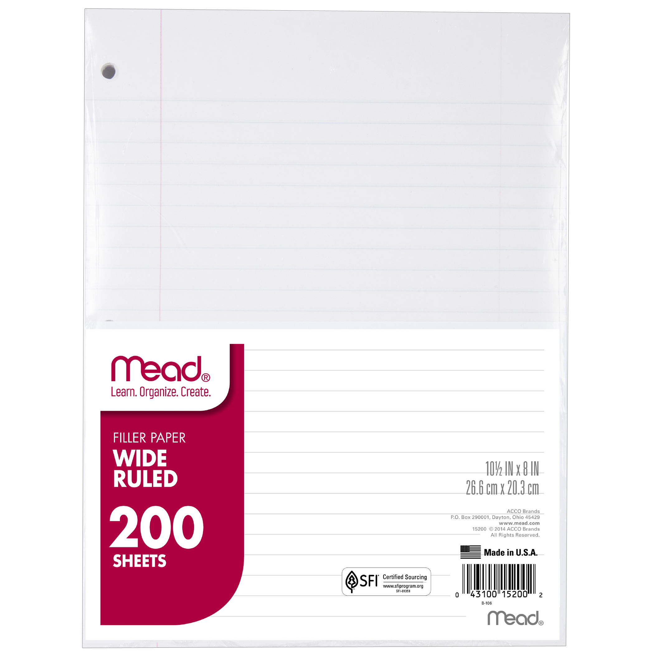 Mead filler paper is 3-hole punched with 3 holes and ready to insert into your favorite binder. The wide ruled sheets give you plenty of space to capture all your notes.
