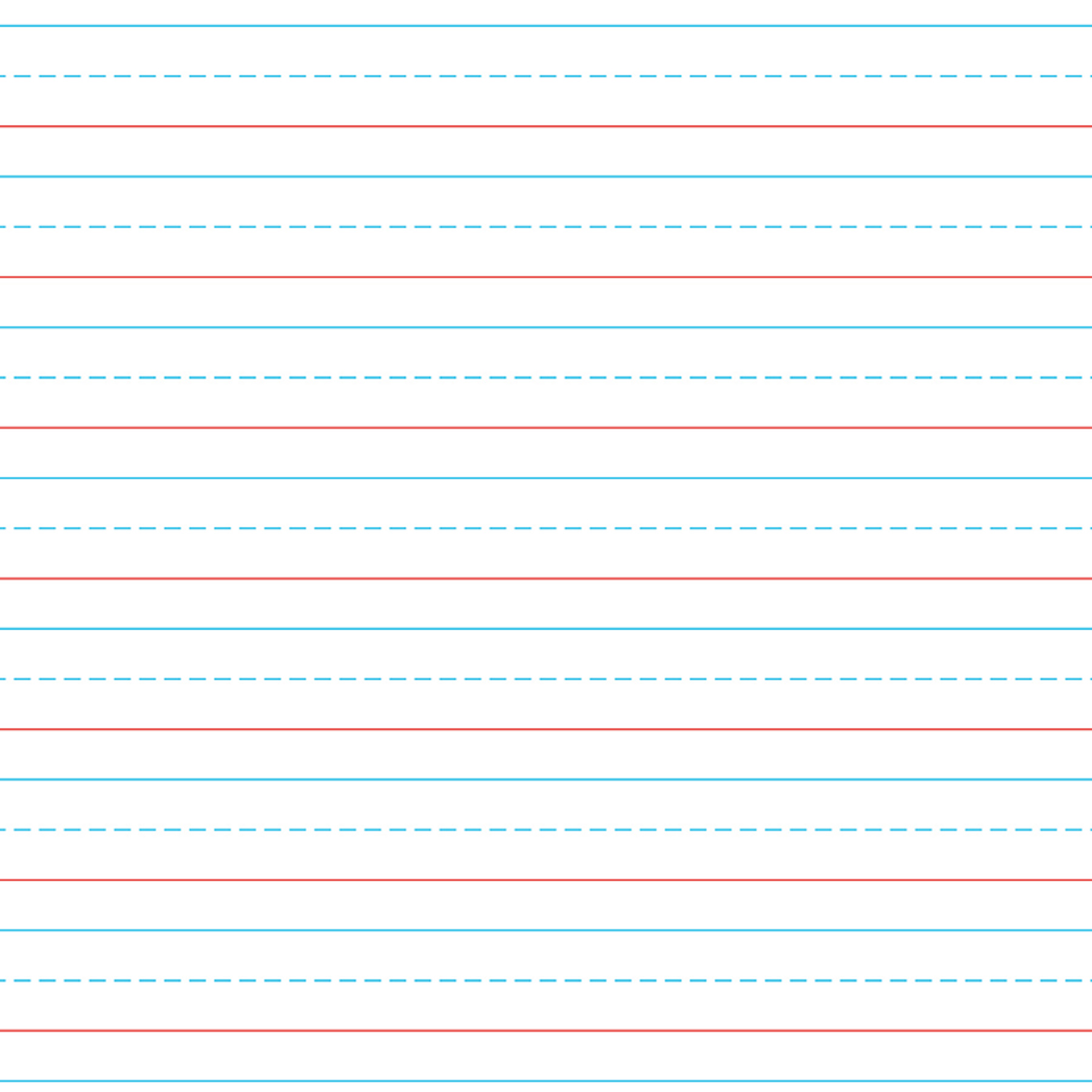i : Handwriting paper has red baseline, blue dotted midline, and blue descender line, with 1/4″ ruling