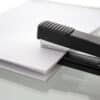The stapler measure 6.25″ x 2.25″ x 1.5″. This all-metal black stapler is designed for durability, with a crafted inner rail that delivers jam resistance. It can fasten up to 20-25 sheets of 80 gsm paper and opens 180 degrees for tacking or crafting use. Precision-engineered chisel point staples easily penetrate papers and reduce miss-staples, ensuring strong and accurate stapling to secure paper documents. The stapler features a lightweight, smooth surface with round edges and is designed for handheld stapling. Its curved, ergonomic shape fits comfortably in the palm of your hand, making it suitable for use in school, home, or office settings. It’s important to keep fingers away from where staples are coming out for safety.