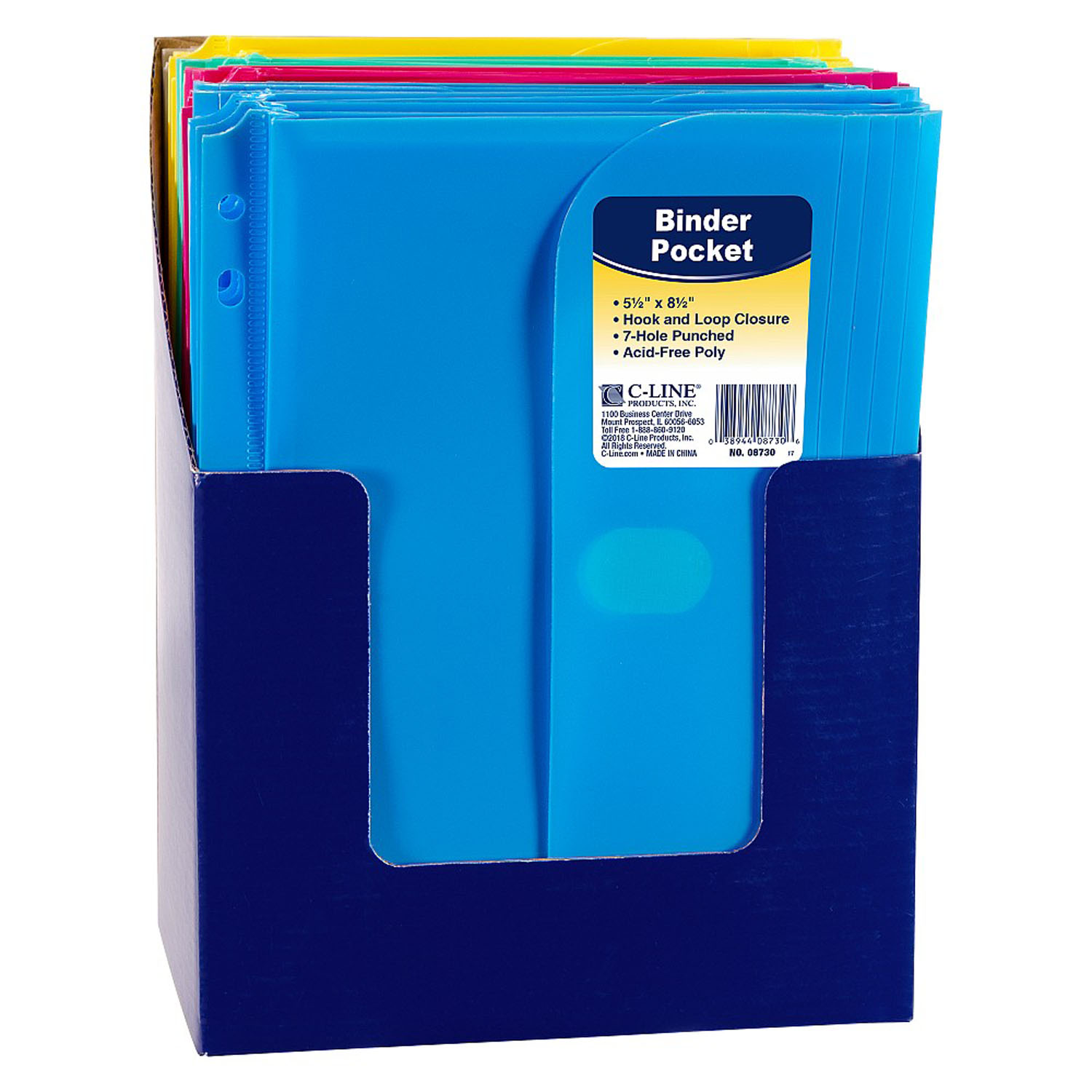 Although mini in size, these mini size binder pockets have proved to offer large organizational benefits. A smaller version of C-Line’s current offering, the binder pocket has a hook and loop closure to secure loose items inside, while having the ability to expand up to 1/2 inch in size to increase capacity. The side loading pocket is prepunched, which allows it to fit into standard 3-ring 5 1/2 x 8 1/2, 6 x 9, and 8 1/2 x 11 binders. Assorted colors include Seaside Blue, Sunny Yellow, Seafoam Green, Sunset Red, and Sandy Gray (no color choice). On-the-go organization is easy with C-Line’s document storage additions! Note: If using a day planner, please check the actual product dimensions and hole punch configuration; does not work with all day planner systems.