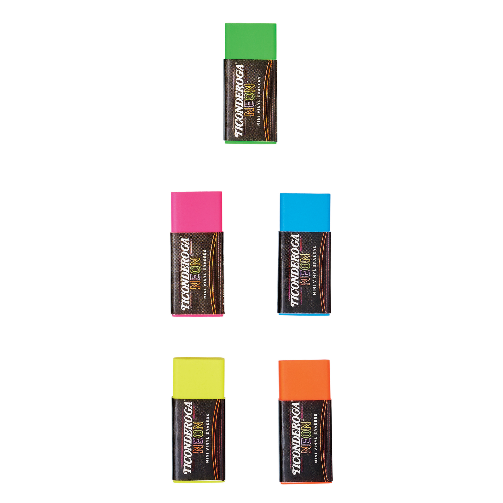 Ticonderoga® Neon Mini Erasers are the bright, fun way to correct life’s little mistakes. Five different colors for each mood or day of the week. Soft vinyl erasers remove pencil marks cleanly without smudges, residue, or tearing paper. Latex free and non-toxic. Each pack includes 5 erasers: neon pink, green, orange, blue, and yellow erasers.