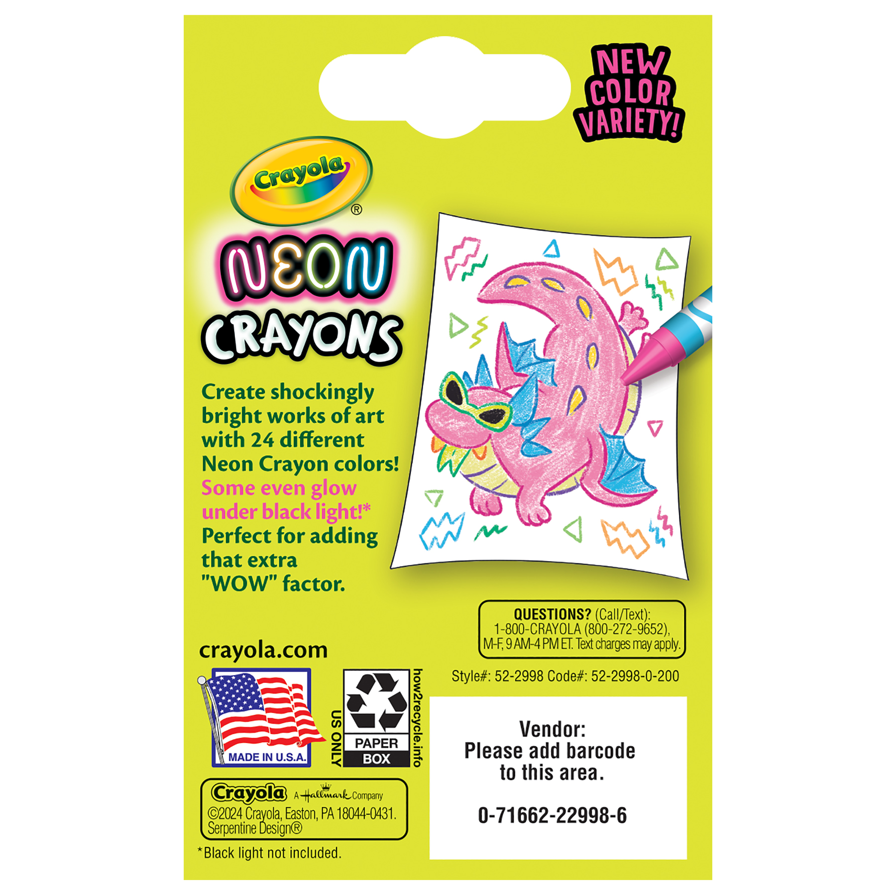 i : NEON CRAYONS: Create shockingly bright works of art with this pack of Neon Crayons for kids, featuring 24 unique colors (including 16 fluorescent colors).