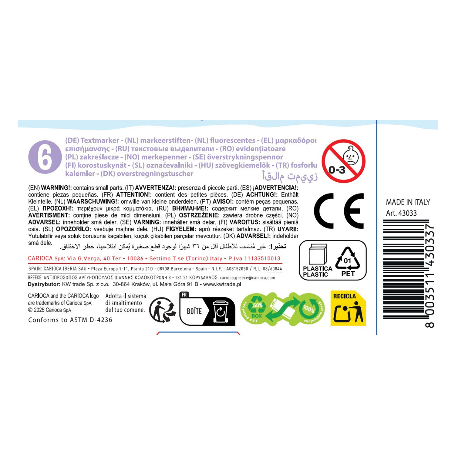 Brighten up your notes and documents with the Carioca Pastel Highlighters – 6 Pieces. This set features soft pastel colors, perfect for adding emphasis without overpowering your text. The highlighters use water-based, washable ink for easy cleanup and safe use on various surfaces. Each marker is equipped with a 4.5 mm chisel tip, allowing for precise highlighting or broad strokes. Compactly presented in a display box, these highlighters are ideal for classrooms, offices, or home use, combining functionality with vibrant style. Made in Italy, they reflect quality and durability in every stroke.