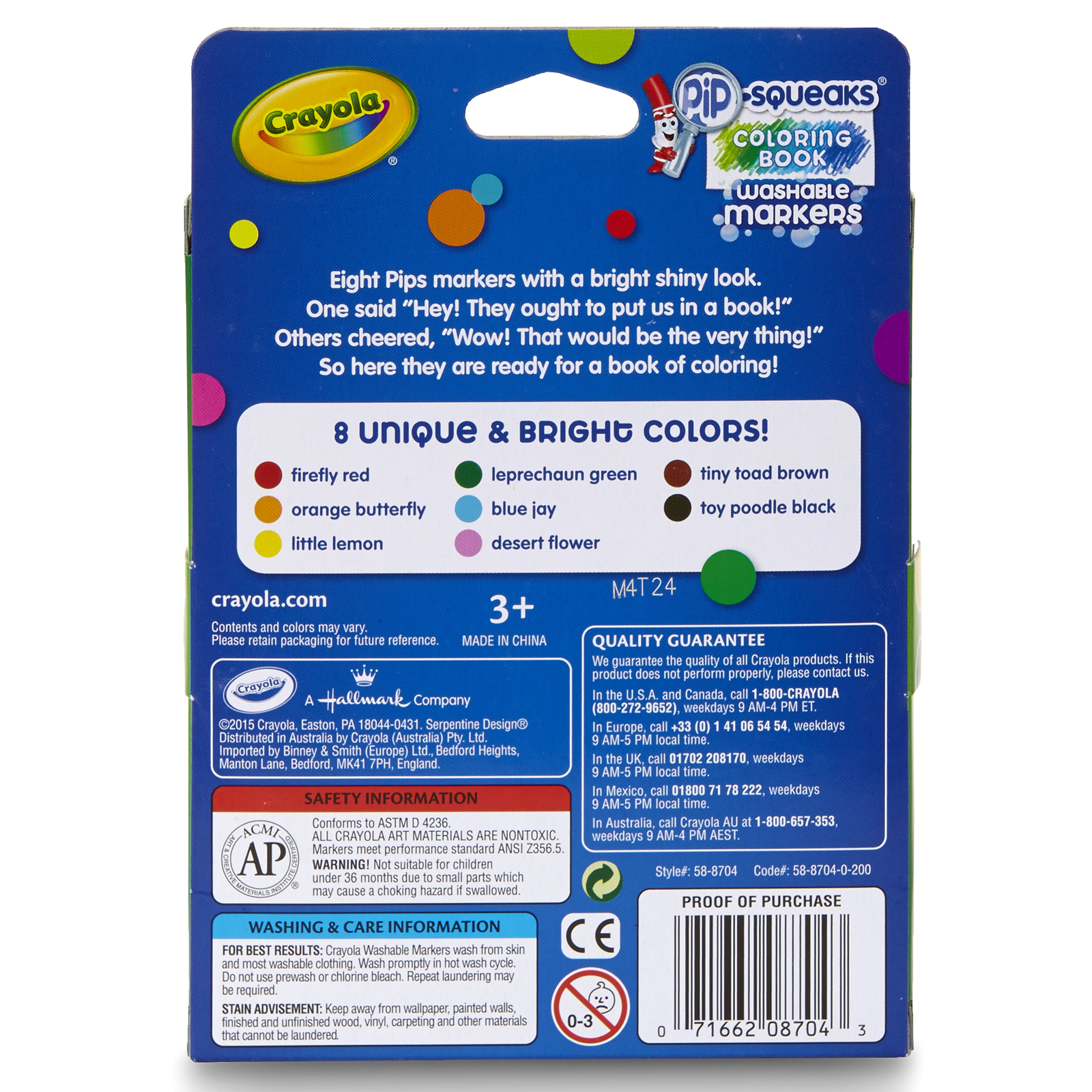 Endearing Pip-Squeaks Markers are small in size, but BIG in color! The easy-to-hold short barrels are scaled to match little hands and the ink is our special washable formula! Features 8 unique colors – not the traditional “school” palette of colors. Each pack includes 8 short, washable coloring book markers.