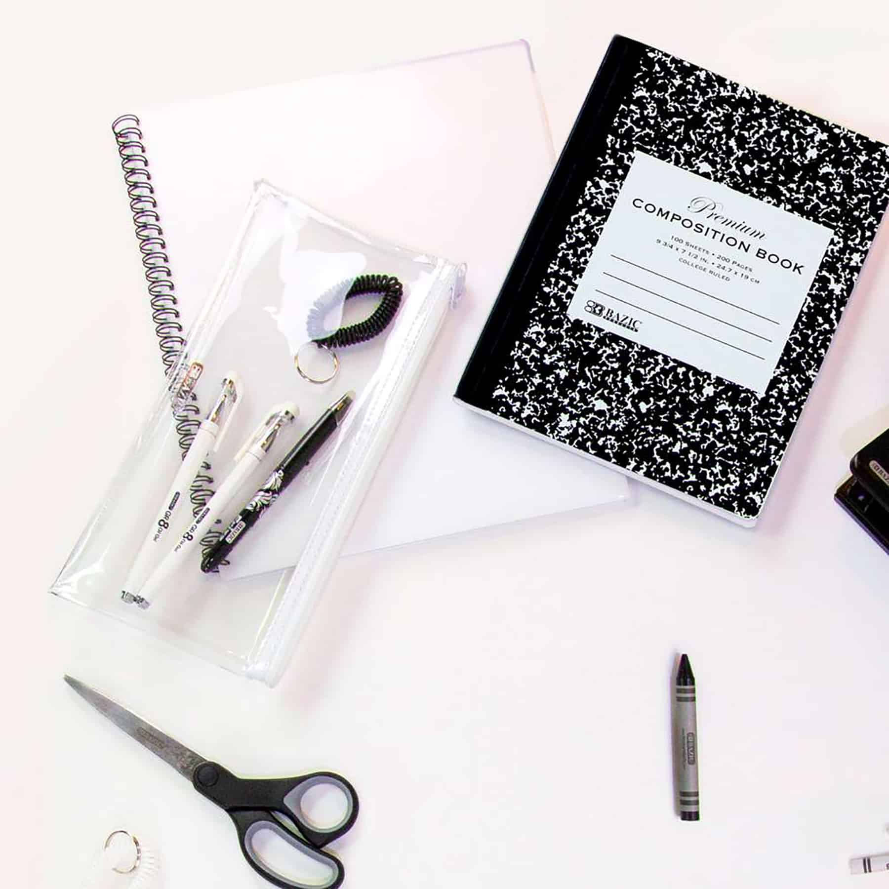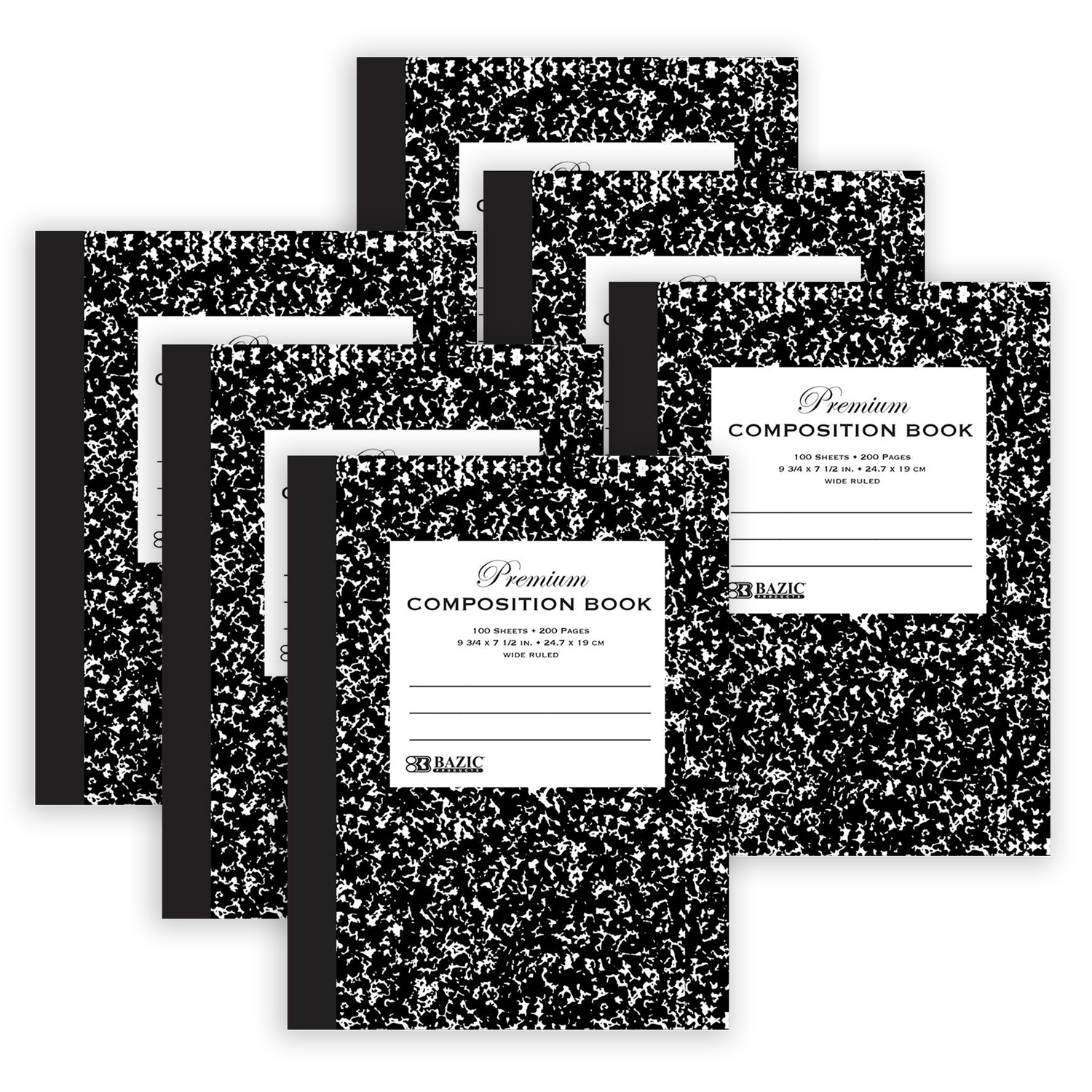 i : SIMPLY NOTETAKING. Black marble composition notebooks come with 100 sheets of wide-ruled paper. Ready for any assignment and take it with you on the go! Overall Size: 9.75″ x 7.5″.