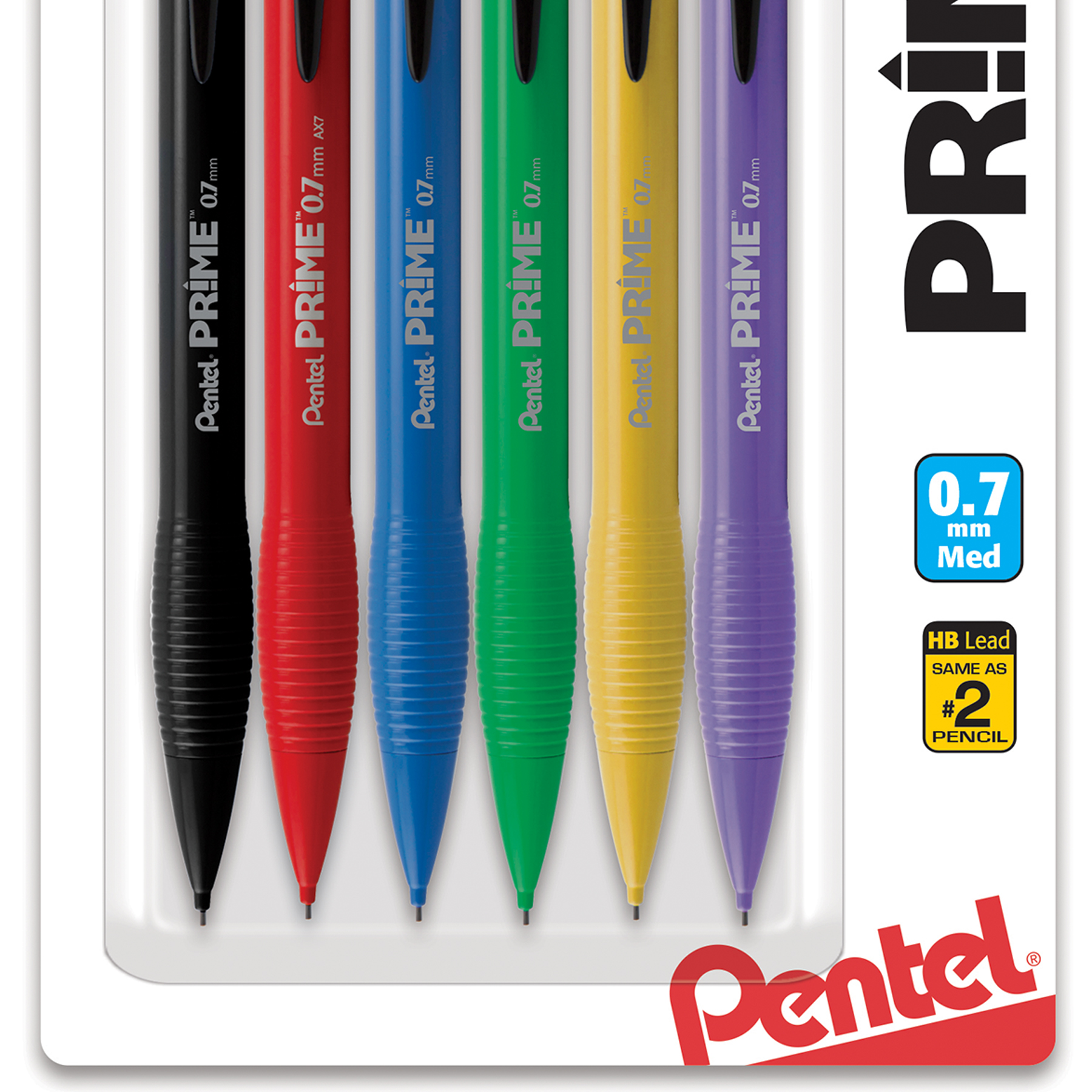 PRIME™ offers Pentel quality in an economy pencil. Molded grip is grooved for writing comfort. Pre-loaded with Super Hi-Polymer® lead. Never needs sharpening, is super strong and produces a clear dark line. 0.7mm (medium). Latex-free eraser. Each pack includes 6 mechanical pencils in assorted barrel colors.