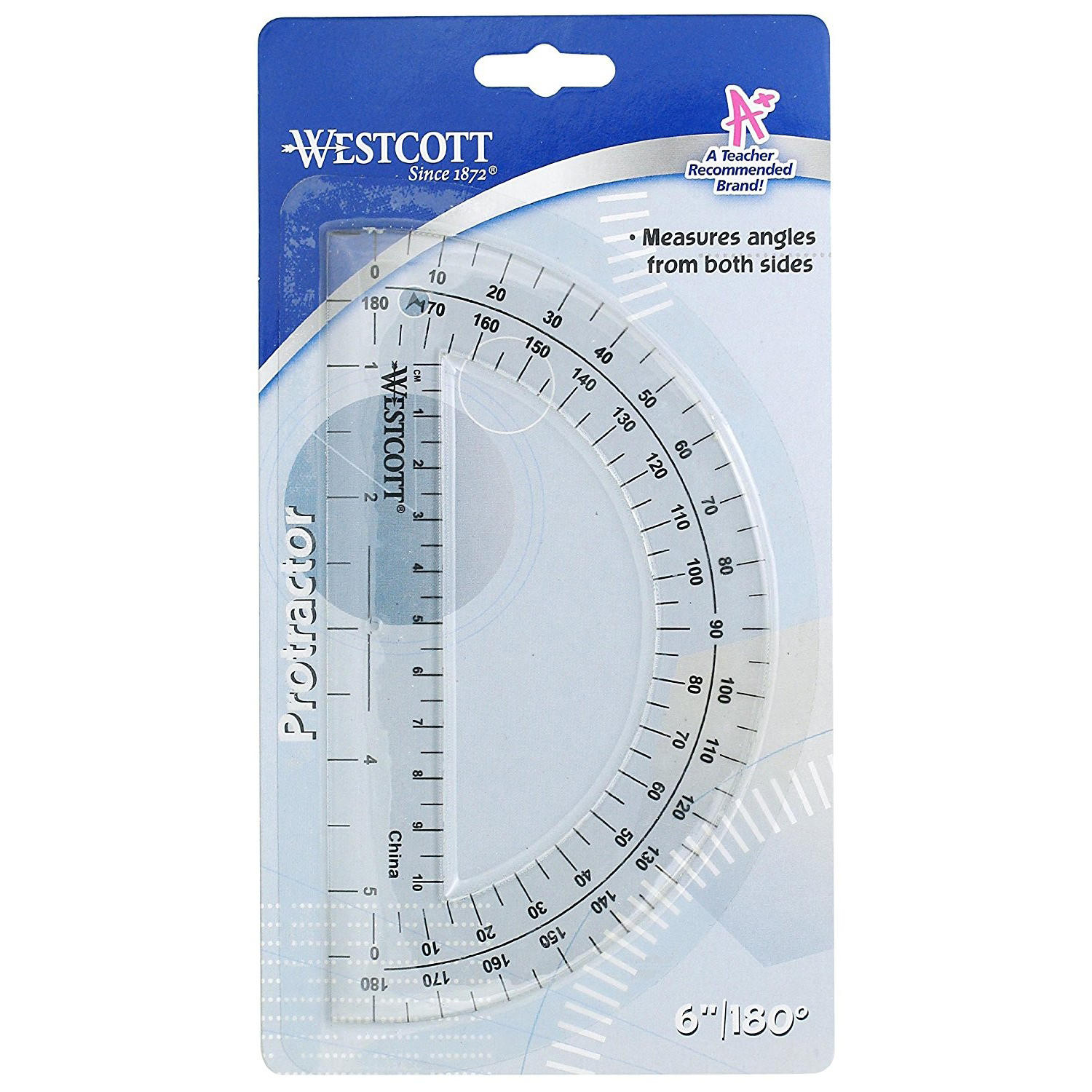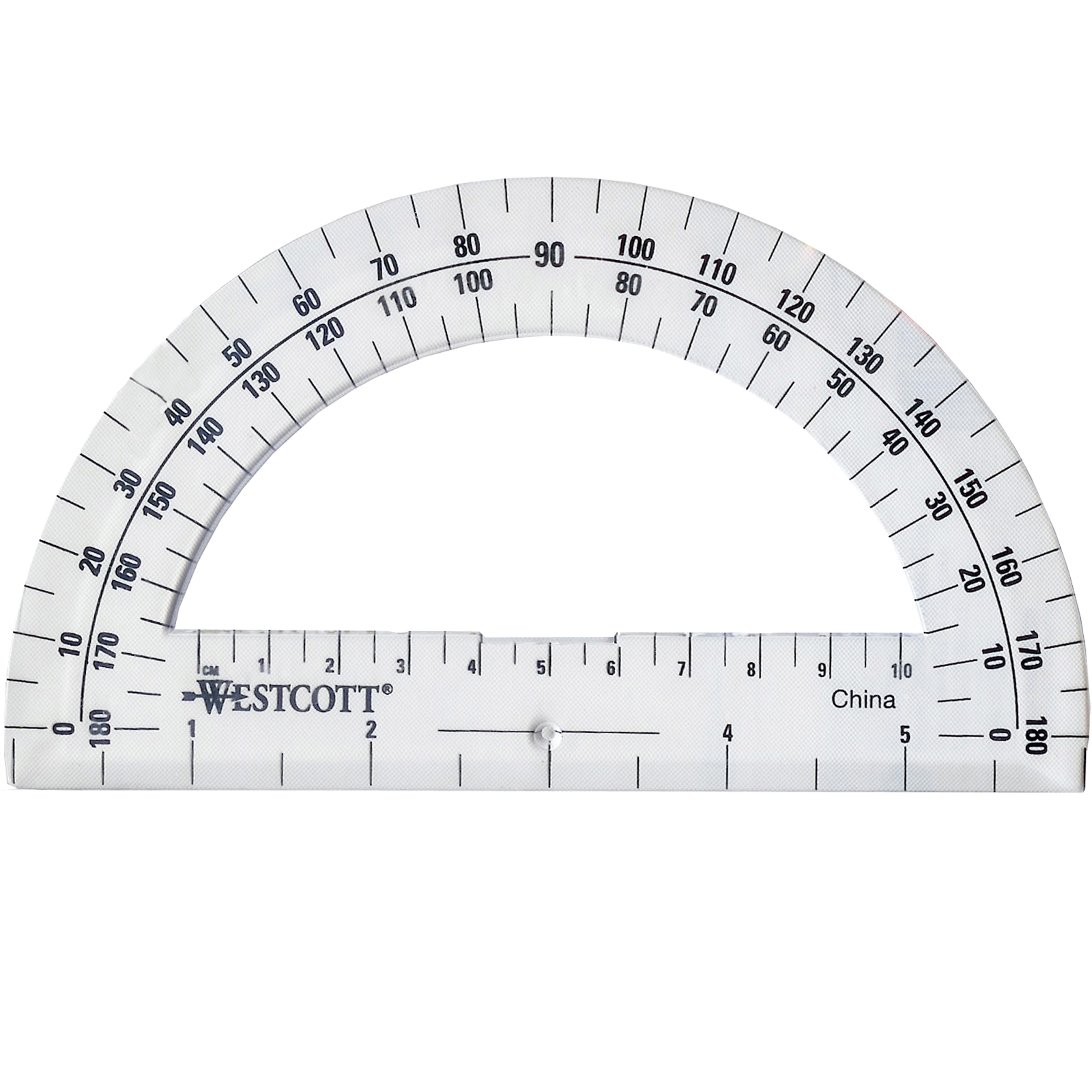 From the leader and cutting and measuring products, Westcott is dedicated to supporting education and inspiring creative activities in the classroom and at home. Products are specifically designed for growing students, created to be fun and functional with superior quality and exceptional value. The Westcott 180 degree protractor is made of sturdy plastic and comes in protective sleeve. Features 0 to 180 degree measurements in 5 degree increments, and a ruler at the bottom for convenient measurements.