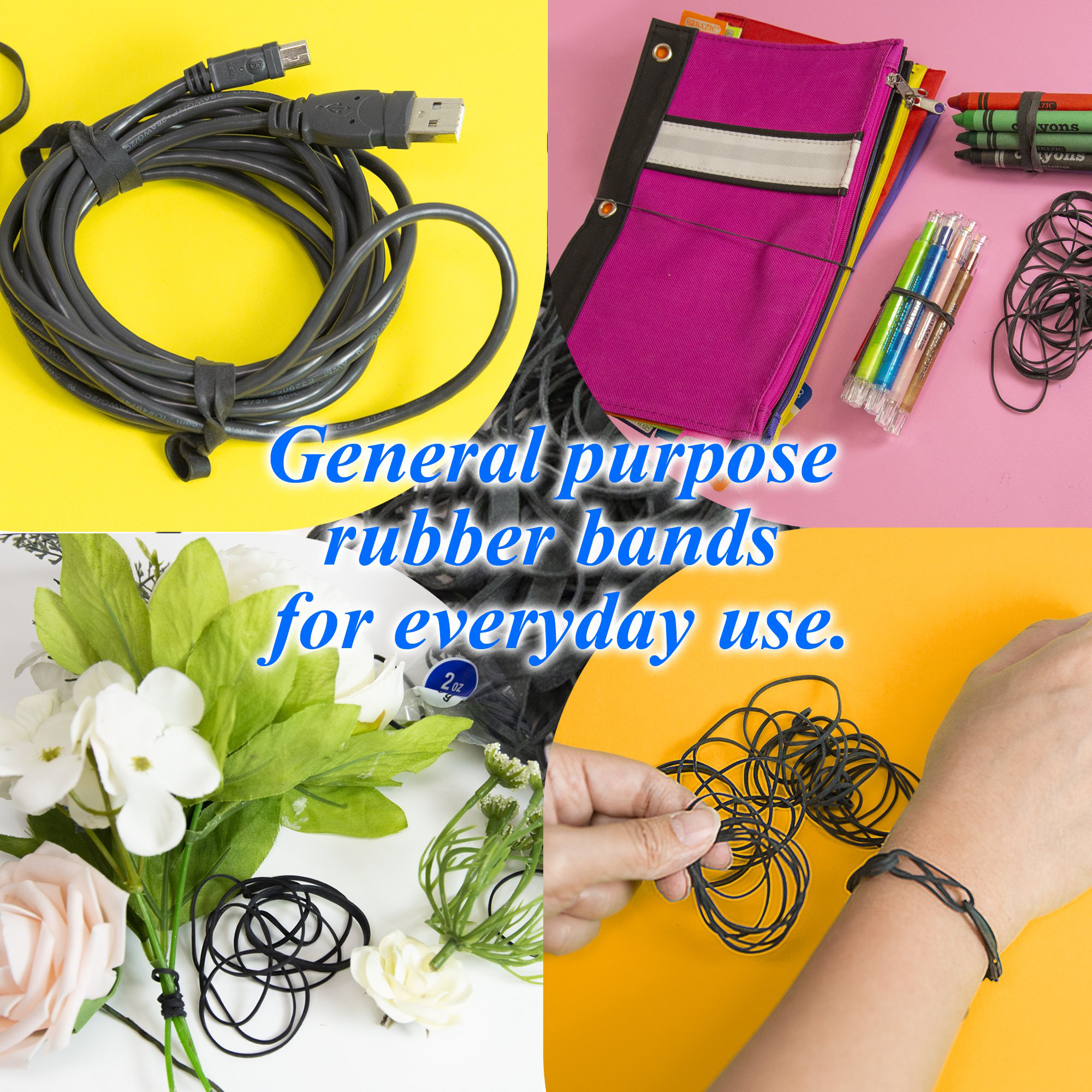 ii : BOND TOGETHER: Come with a variety of sizes and shapes for all of your binding needs. Perfect for practical everyday use or even for more creative ideas like rubber band balls or tie dying shirts.