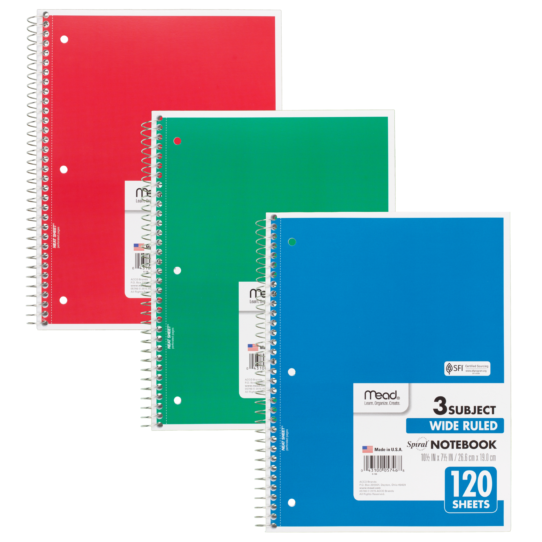 Get more usable space and stay organized with the 3 subject notebook that is wide ruled and available in a variety of colors. It’s versatile and perfect for a variety of uses including in-class notetaking and recording meeting notes. Pages are wide ruled and double-sided to provide plenty of notetaking space. Includes dividers to separate notebook into 3 subjects. Notebook spiral binding will not snag and resists uncoiling to keep your notes together. Notebook covers are coated for durability. White paper; 120 sheets, 10 1/2″ x 8″ page size. Assorted cover colors (no color choice).