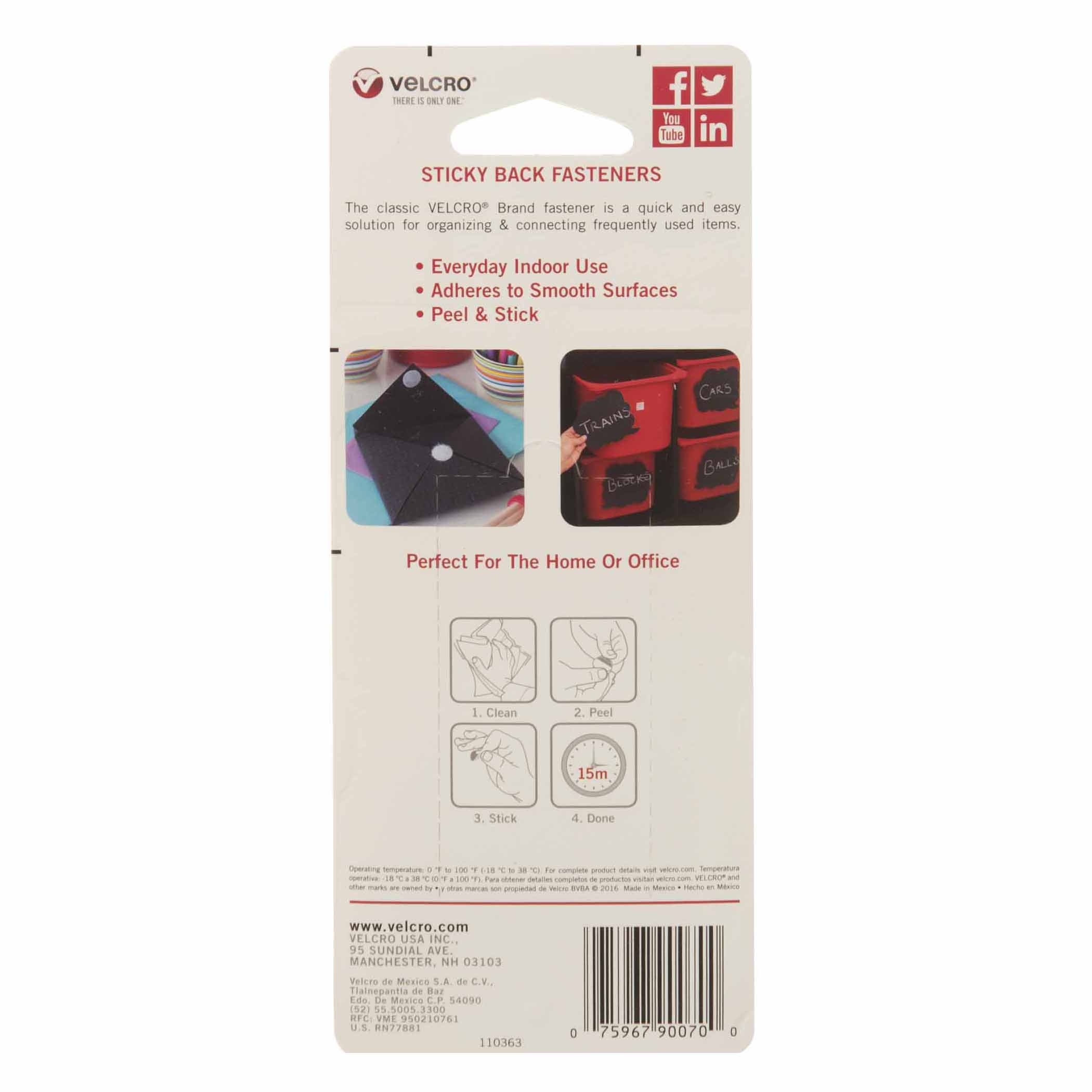 VELCRO® Brand Sticky Back Fasteners are perfect for smooth surfaces such as walls, glass, tile, plastic, metal and wood. Sticky Back Fasteners are incredibly versatile and are even water resistant. Our adhesive tape, strips and coins give you an array of options for keeping things organized and connected. A durable and long lasting fastening solution perfect for around the house, classroom, office and garage! Unlimited possibilities for organization and crafting. Each pack includes 15 sets of 5/8″ diameter VELCRO coins.