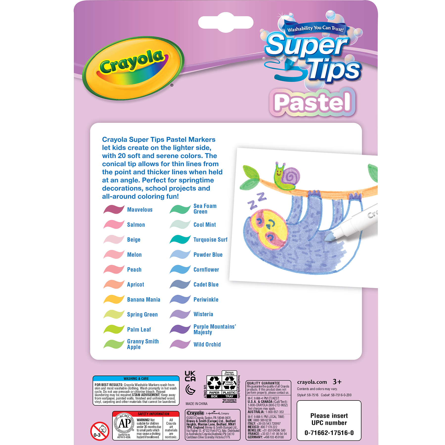 Add a splash of pastel color to your artwork with Crayola Pastel Supertip Washable Markers! This 20 count pack includes a variety of soft pinks, blues, and greens, perfect for adding a touch of whimsy to your school projects, coloring books, and crafts. The durable Supertips design allows you to create both thick and thin lines, making these markers versatile for all your drawing and writing needs. Plus, with the washable formula, you won’t have to worry about stains on skin or washable clothing. Stock up on these long-lasting markers, designed to provide endless creativity without drying out easily. These markers are also AP certified nontoxic, making them safe and child-friendly. Perfect for kids ages 4 and up, these Pastel Supertip Markers make a great gift for any young artist.