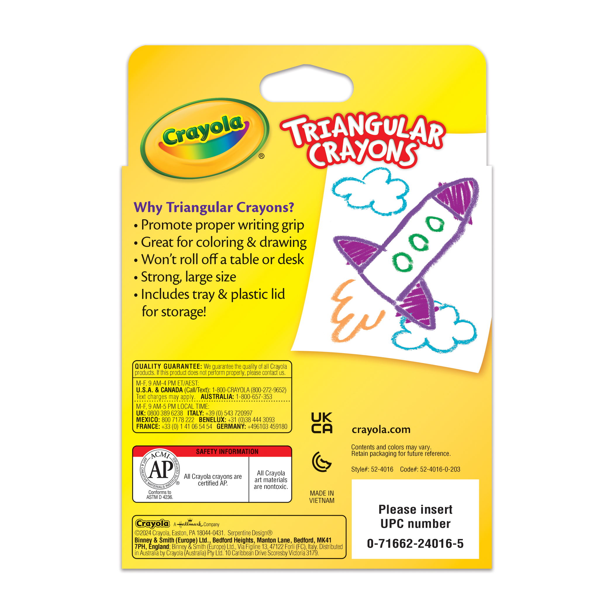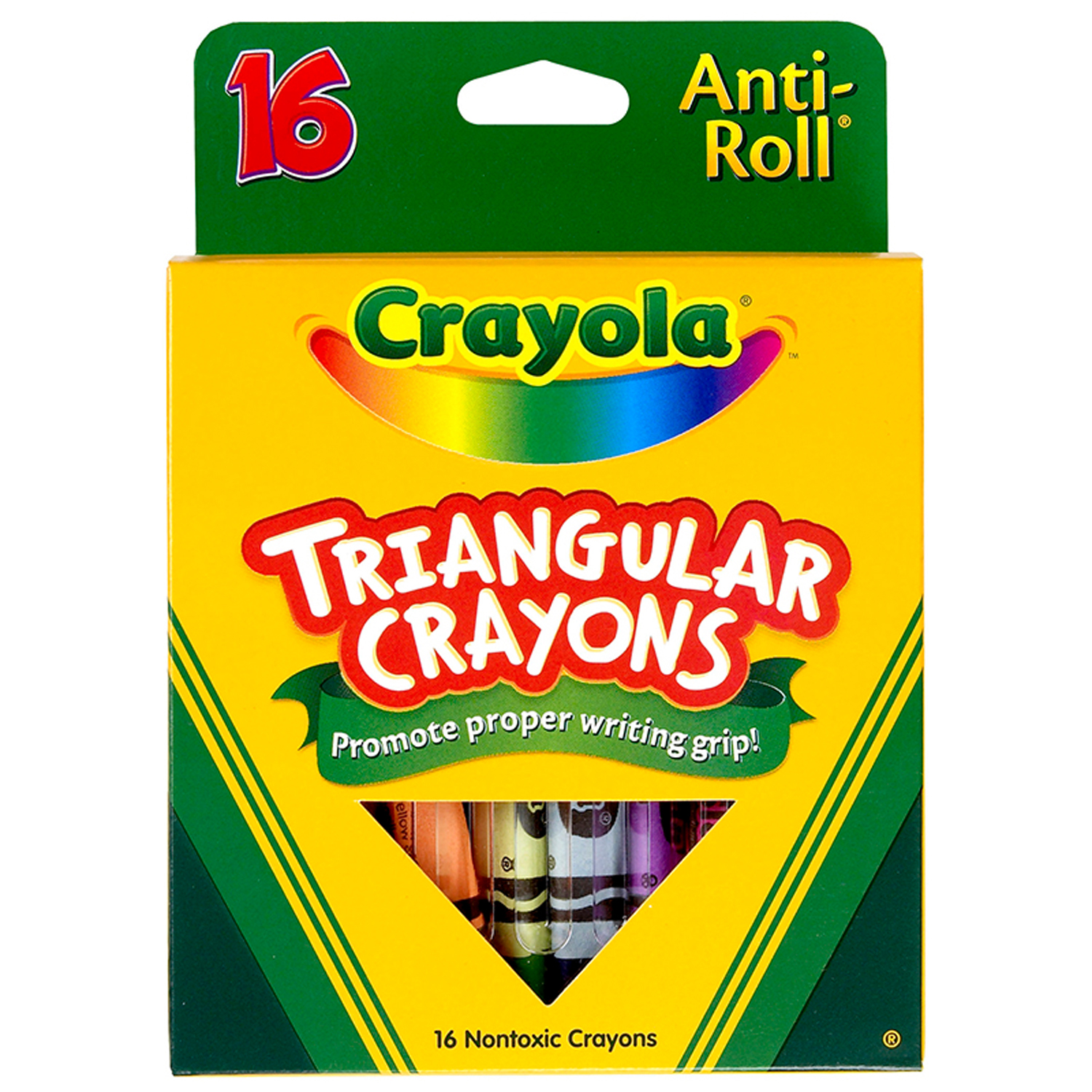 Guides little fingers toward a writing grip. Washable Triangular Crayons are the right shape to help guide toddlers fingers into the tripod position for more purposeful and controlled drawing. As children approach 24 months, they begin to hold crayons with the thumb and two fingers. Their scribbles now look like the zigzags or tighter, more controlled circles. The tripod grip is important for developing later writing skills. Crayola Beginnings Washable Triangular Crayons are designed to easily wash off walls with just warm water and a sponge. Each box includes 16 crayons in a tray.