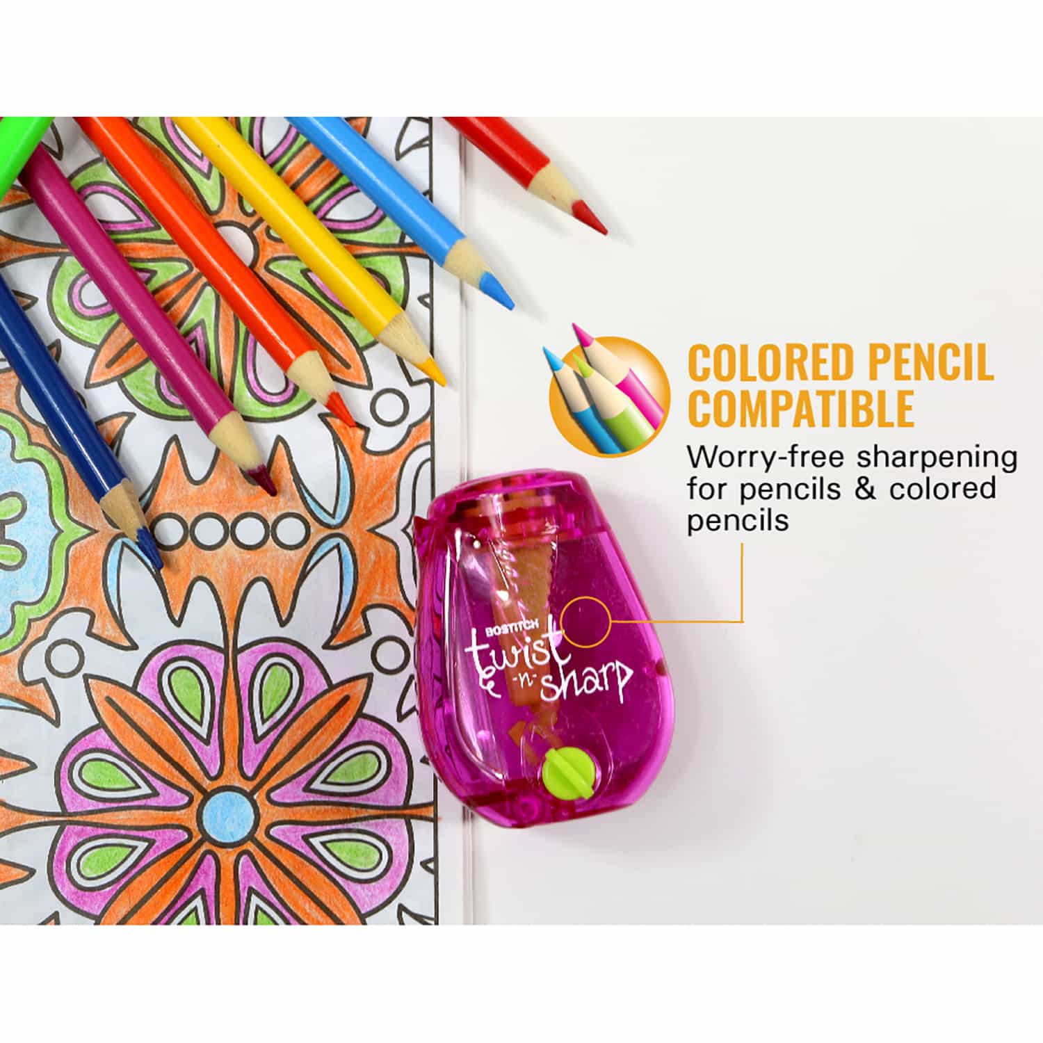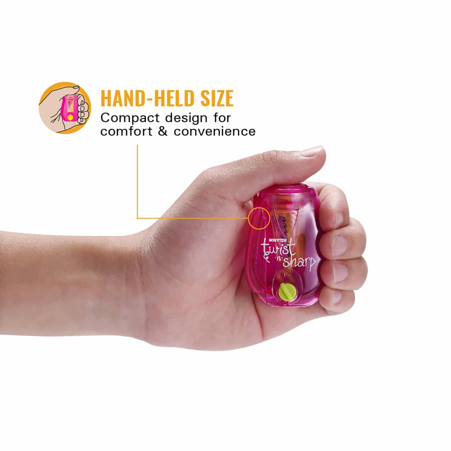 Sharpen pencils to the perfect pointed or blunt tip with a few twists of your wrists! The Twist-n-Sharp is equipped with a special ratchet mechanism that makes manual sharpening quick and effortless for all ages, plus its compact size makes it perfect for any school or travel bag. Its Tip Saver Technology™ prevents oversharpening, while an adjustable knob allows you to sharpen your pencils to a standard pointed or blunt tip. An easy to clean, built-in shavings tray captures pencil shavings to reduce mess. Sold individually in an assortment of bright and trendy translucent colors including blue, orange and pink (no color choice).