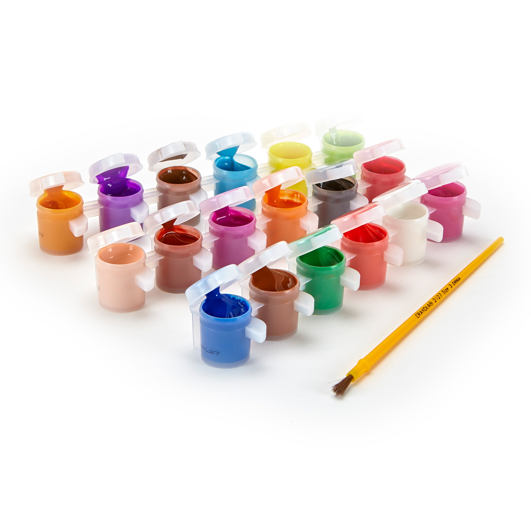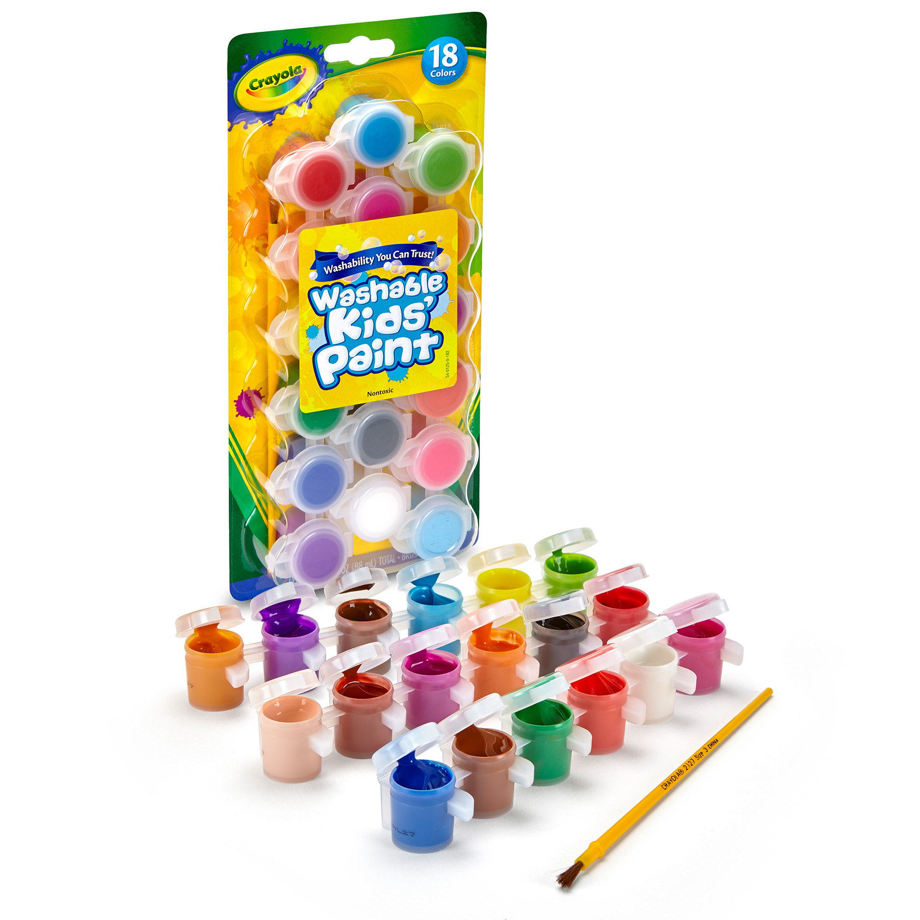 i : CRAYOLA PAINT SET: Features 18 colors of Crayola Washable Paints in paint pots, as well as a paintbrush to get started right away.