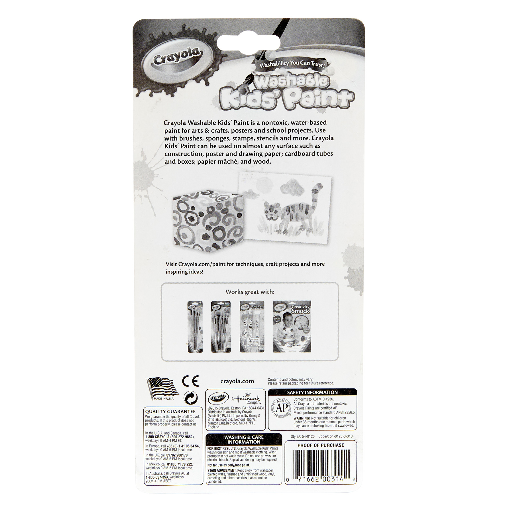 Unleash your child’s imagination with this set of Washable Paints from Crayola. Includes 18 compartments of Washable Kids Paint and a Paintbrush. These Water Based Tempera Paints wash easily from hands, surfaces, and even clothing Kids can experiment with color and create stunning masterpieces, and you won’t have to worry about stubborn stains, marks, or messes. Even better, painting helps develop fine motor skills and teaches color mixing and blending. It’s the perfect kids painting set for arts and crafts, school projects, daycare activities, and more. Makes a great gift for creative kids Safe and nontoxic, ages 3 and up. This product is ACMI Certified.