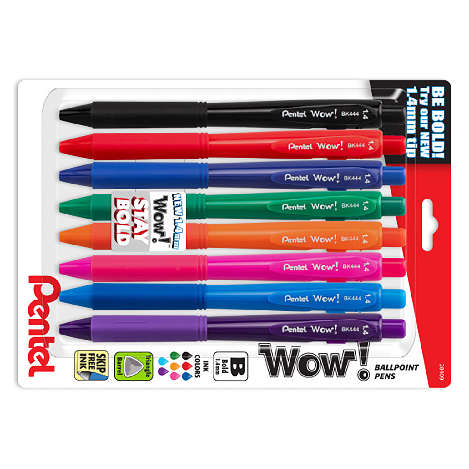 Wow! Retractable Ballpoint Pen, (1.4mm) Bold Line, Assorted Ink, 8-Pack