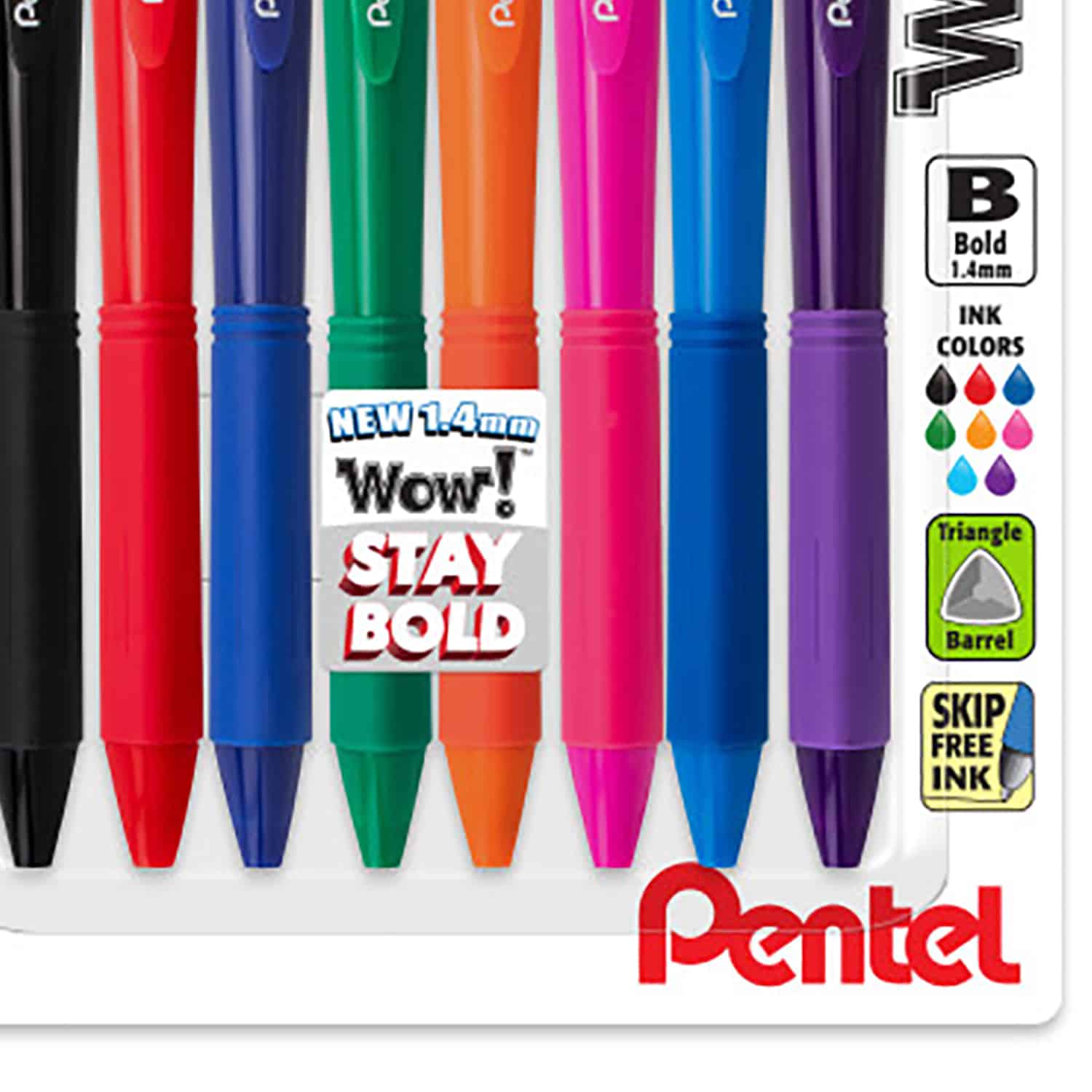 The Wow! retractable ballpoint pens triangular-shaped barrel and latex-free grip is easy to hold and doesn’t roll off desks. 1.4mm metal tip writes bold lines. Distinctive design stands out in a crowd. Maximum comfort and control with the latex-free grip. Each pack includes 8 pens in assorted ink colors: black, blue, red, green, violet, orange, pink, and sky blue.